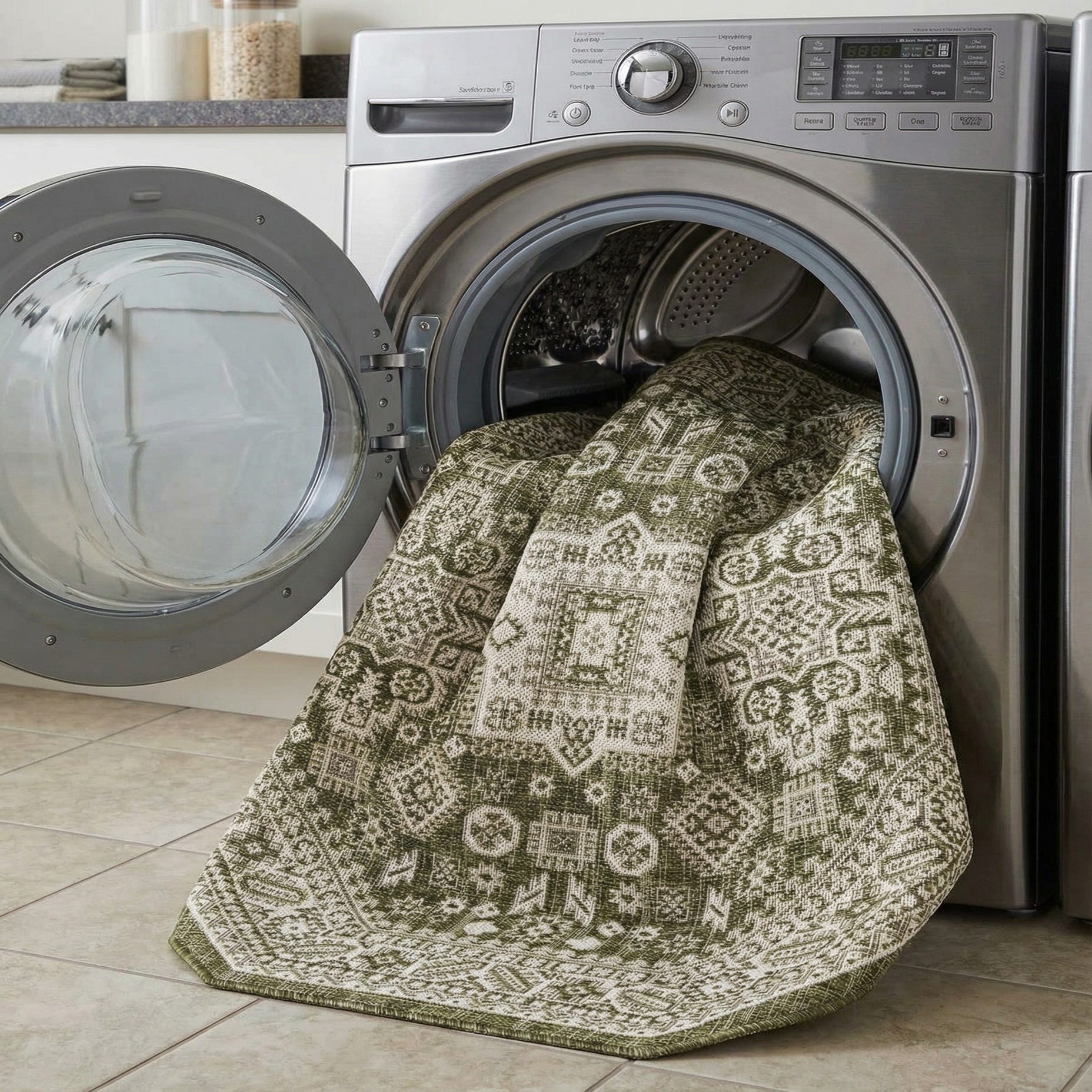 Primary color is Green. Colors in this rug include: Green, Ivory.