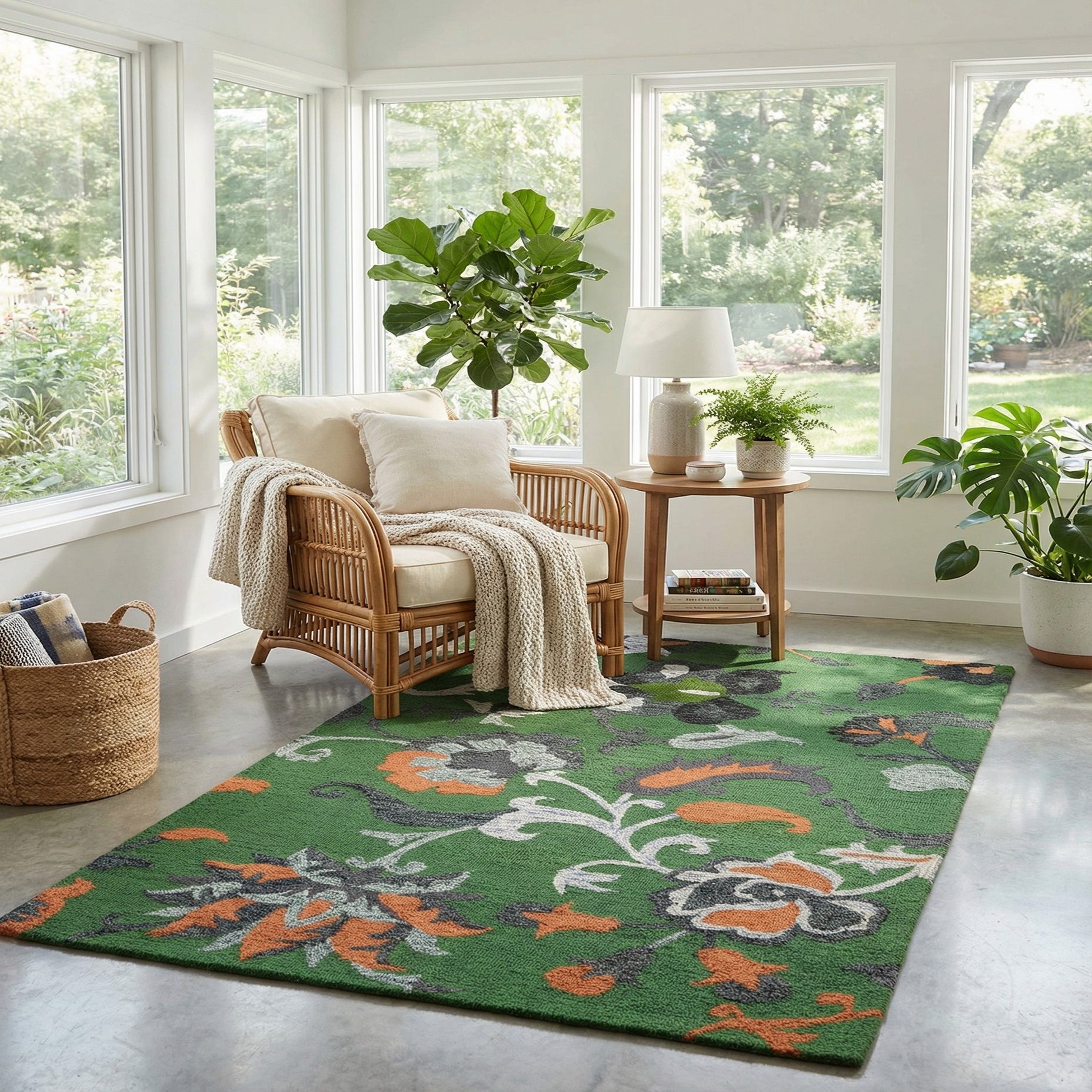 Primary color is Green. Colors in this rug include: Green, Navy Blue, Terracotta, Ivory, Blue, Black.