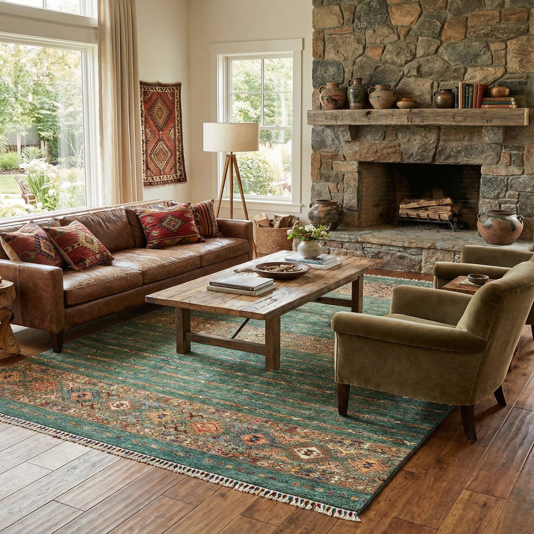 Primary color is Green. Colors in this rug include: Green, Light Brown, Orange, Brown, Red.