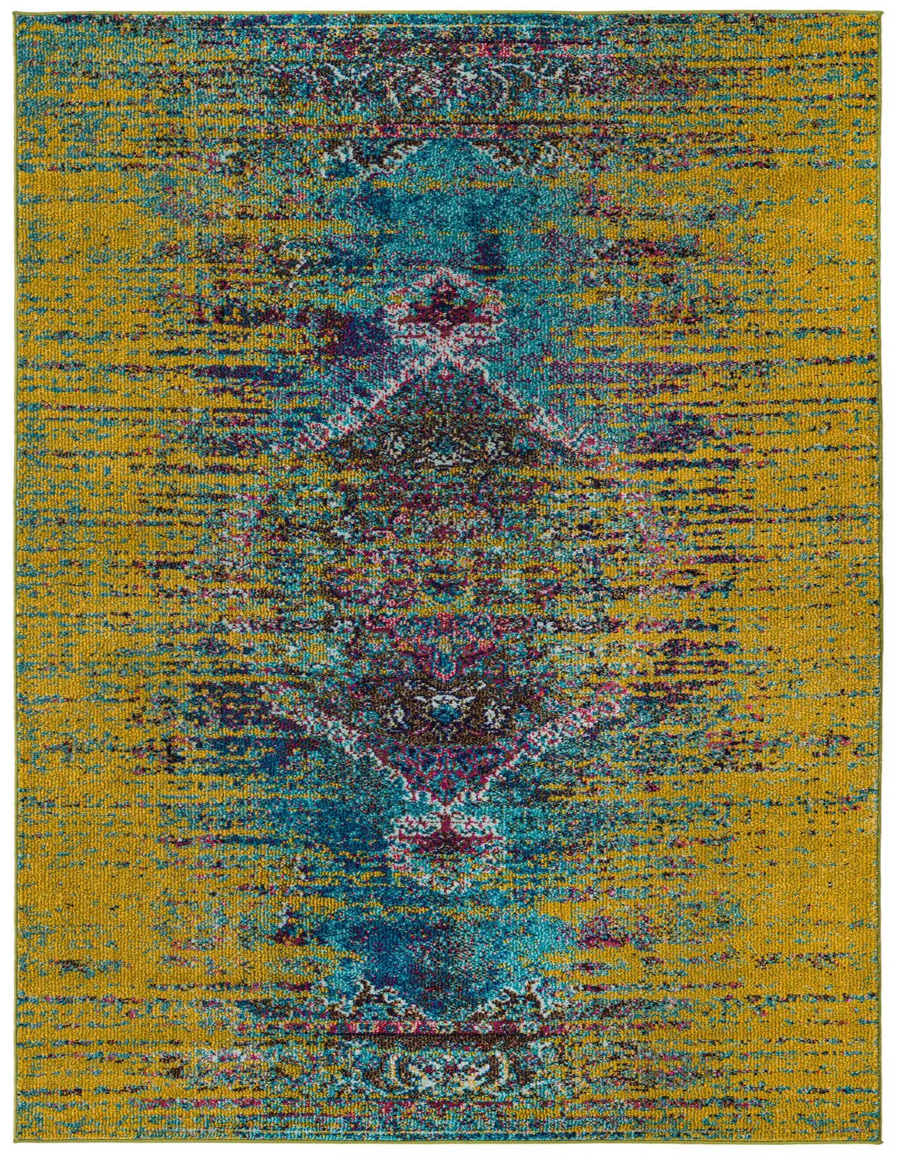 Primary color is Green. Colors in this rug include: Green, Blue, Brown, Navy Blue, Pink, Yellow.