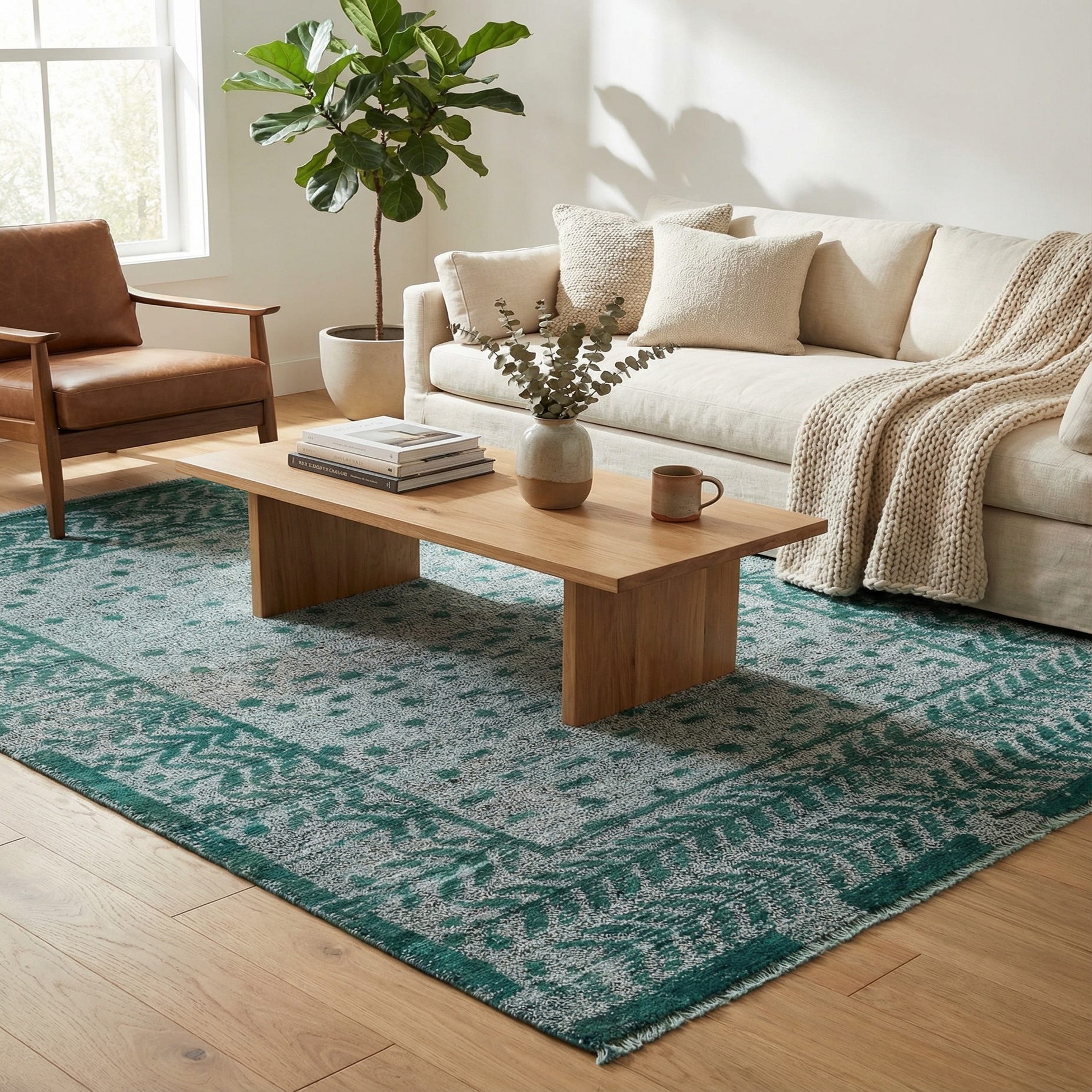 Primary color is Green. Colors in this rug include: Green, Light Blue.