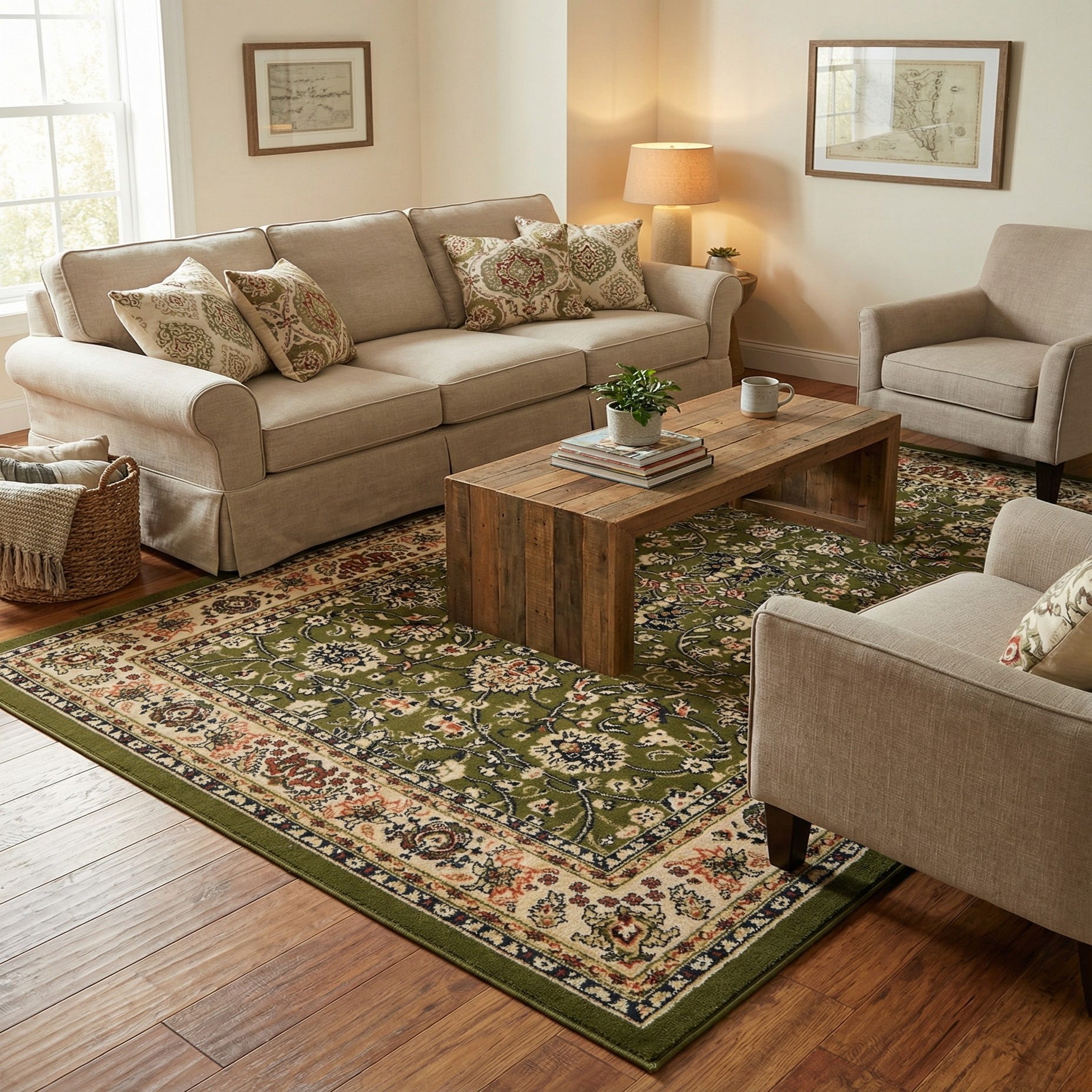 Primary color is Green. Colors in this rug include: Green, Cream, Terracotta, Navy Blue.