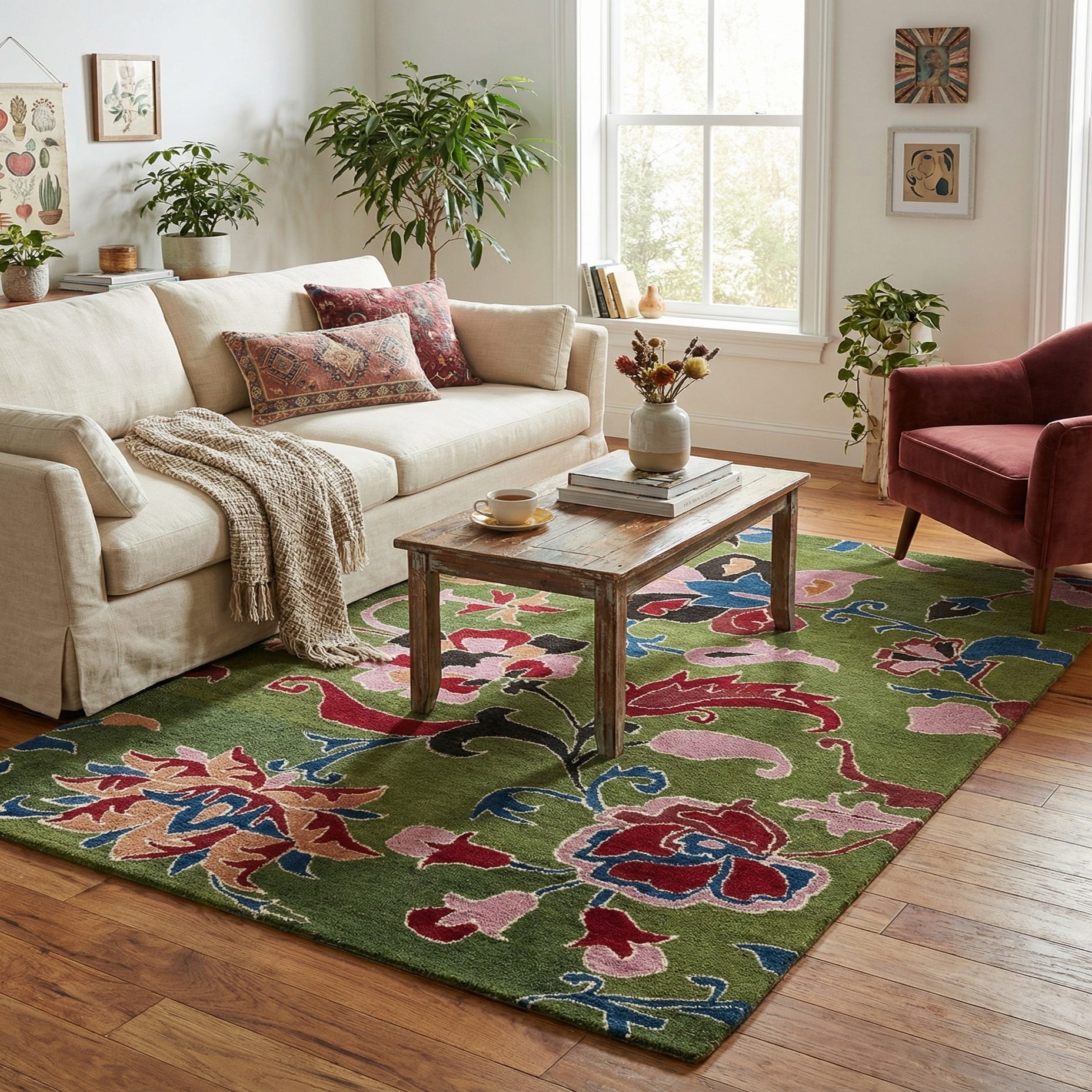 Primary color is Green. Colors in this rug include: Green, Black, Ivory, Terracotta, Pink.