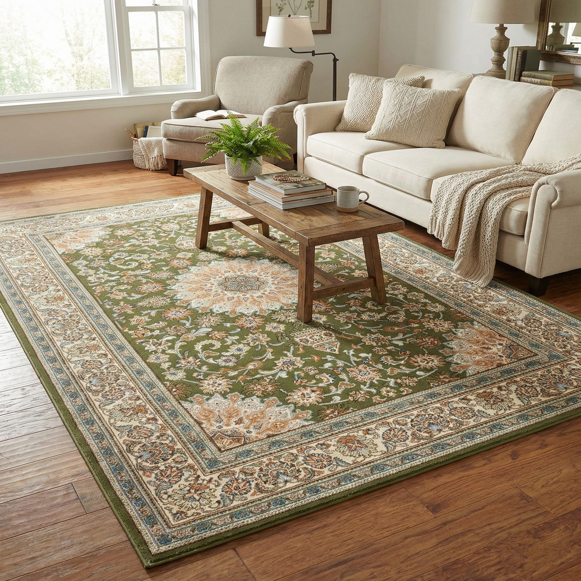 Primary color is Green. Colors in this rug include: Green, Brown, Ivory, Navy Blue, Beige.