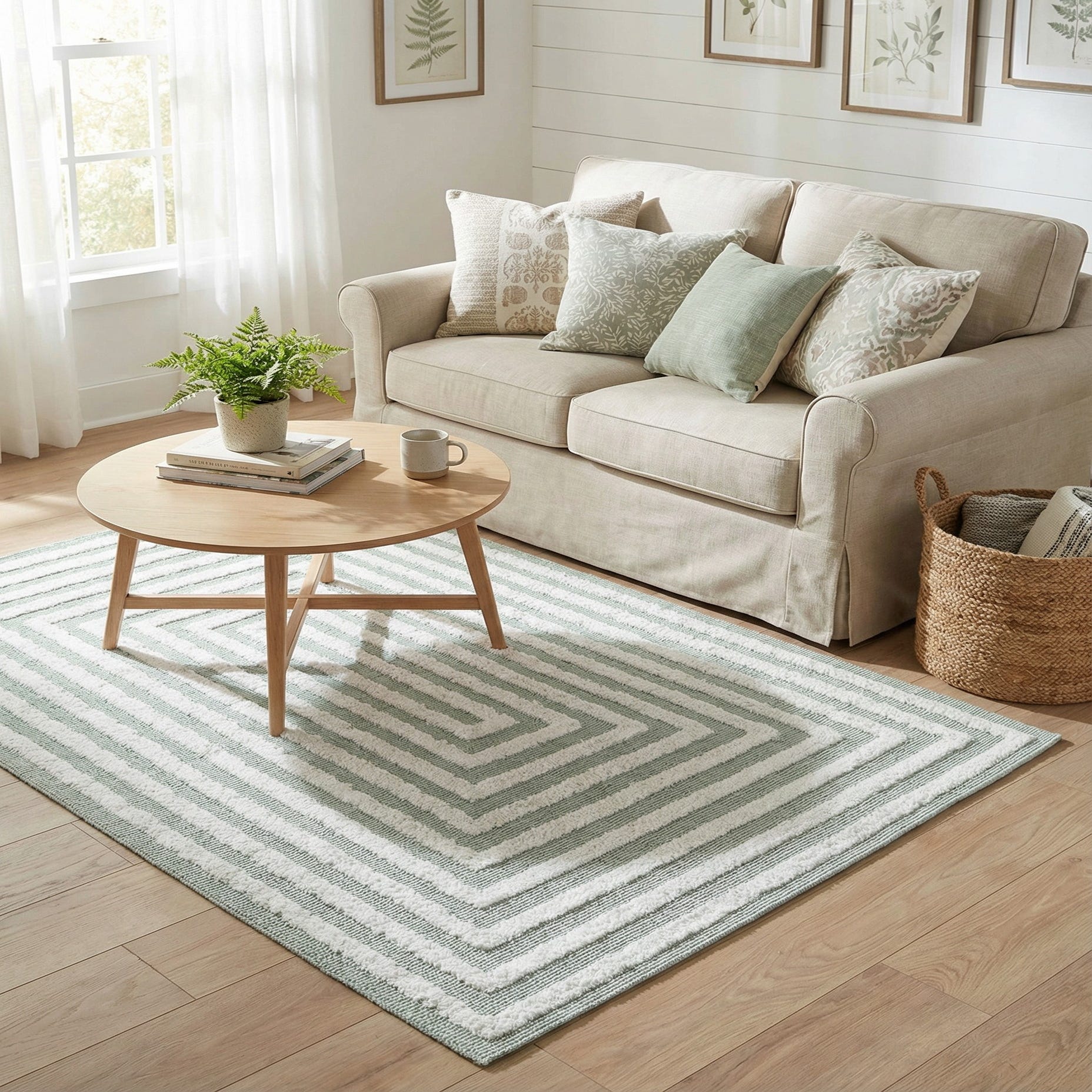 Primary color is Green. Colors in this rug include: Green, Ivory.