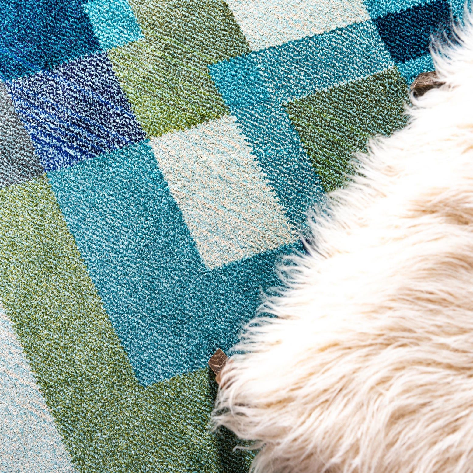 Primary color is Green. Colors in this rug include: Green, Beige, Black, Blue, Light Blue, Olive, Purple, Turquoise.