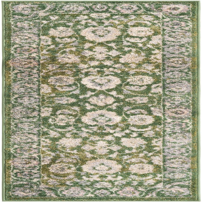 Primary color is Green. Colors in this rug include: Green, Gray, Hunter Green, Ivory, Pink.