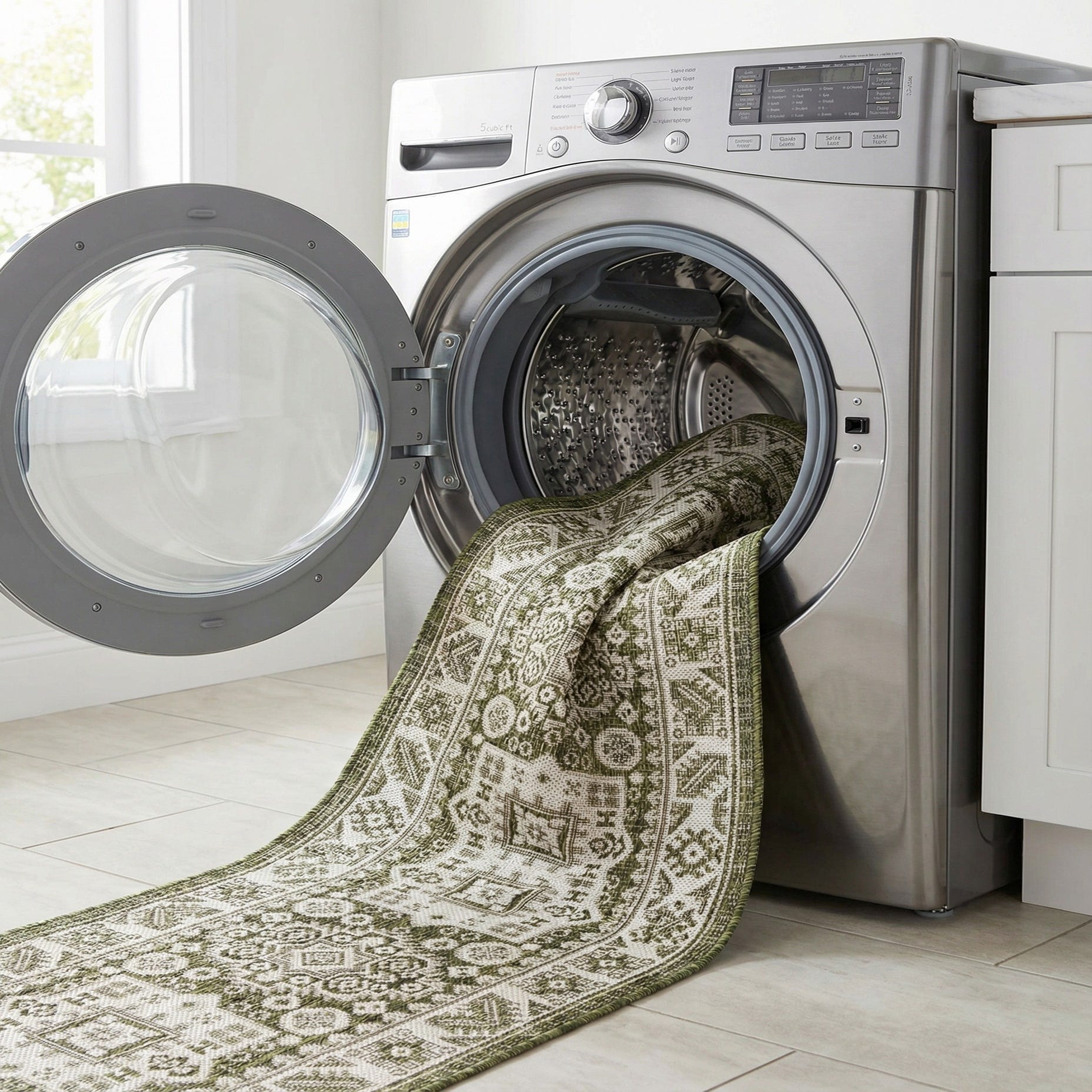 Primary color is Green. Colors in this rug include: Green, Ivory.