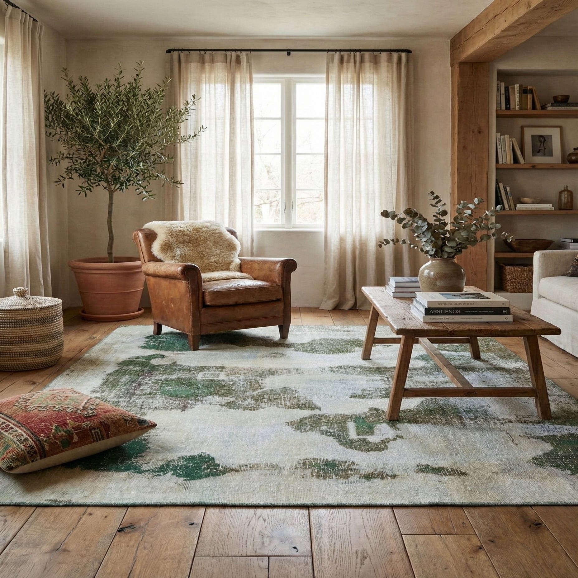 Primary color is Green. Colors in this rug include: Green, Ivory, Olive.