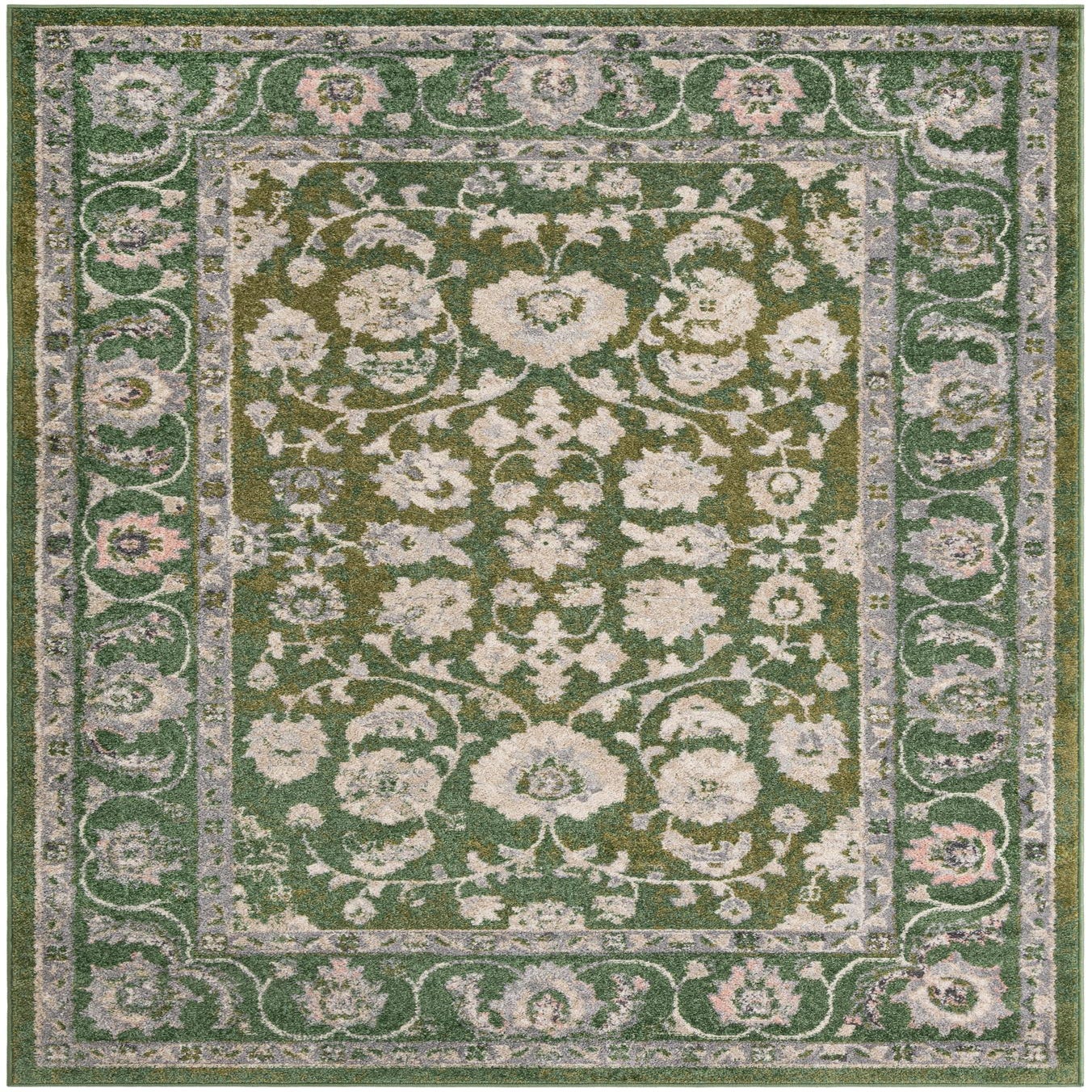 Primary color is Green. Colors in this rug include: Green, Gray, Ivory, Hunter Green, Pink.