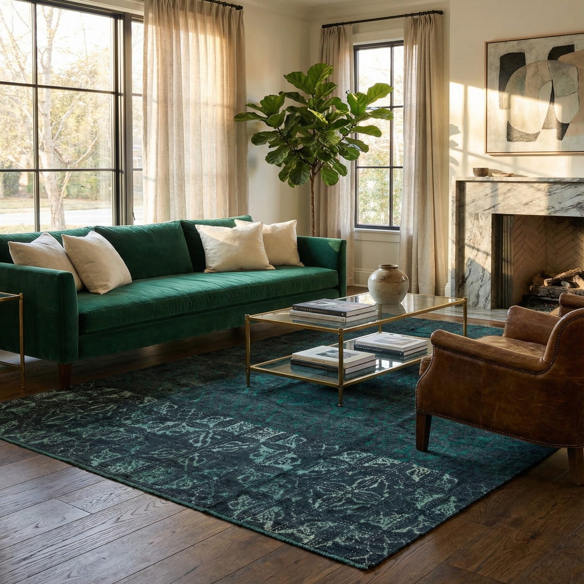Primary color is Green. Colors in this rug include: Green, Black, Ivory.