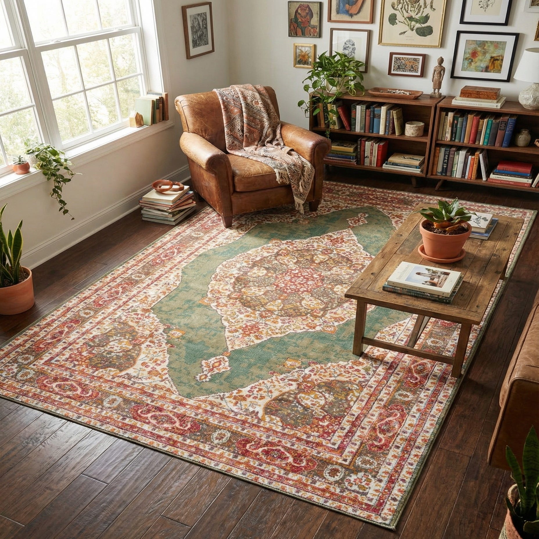 Primary color is Green. Colors in this rug include: Green, Blue, Ivory, Olive, Orange, Red, Yellow.