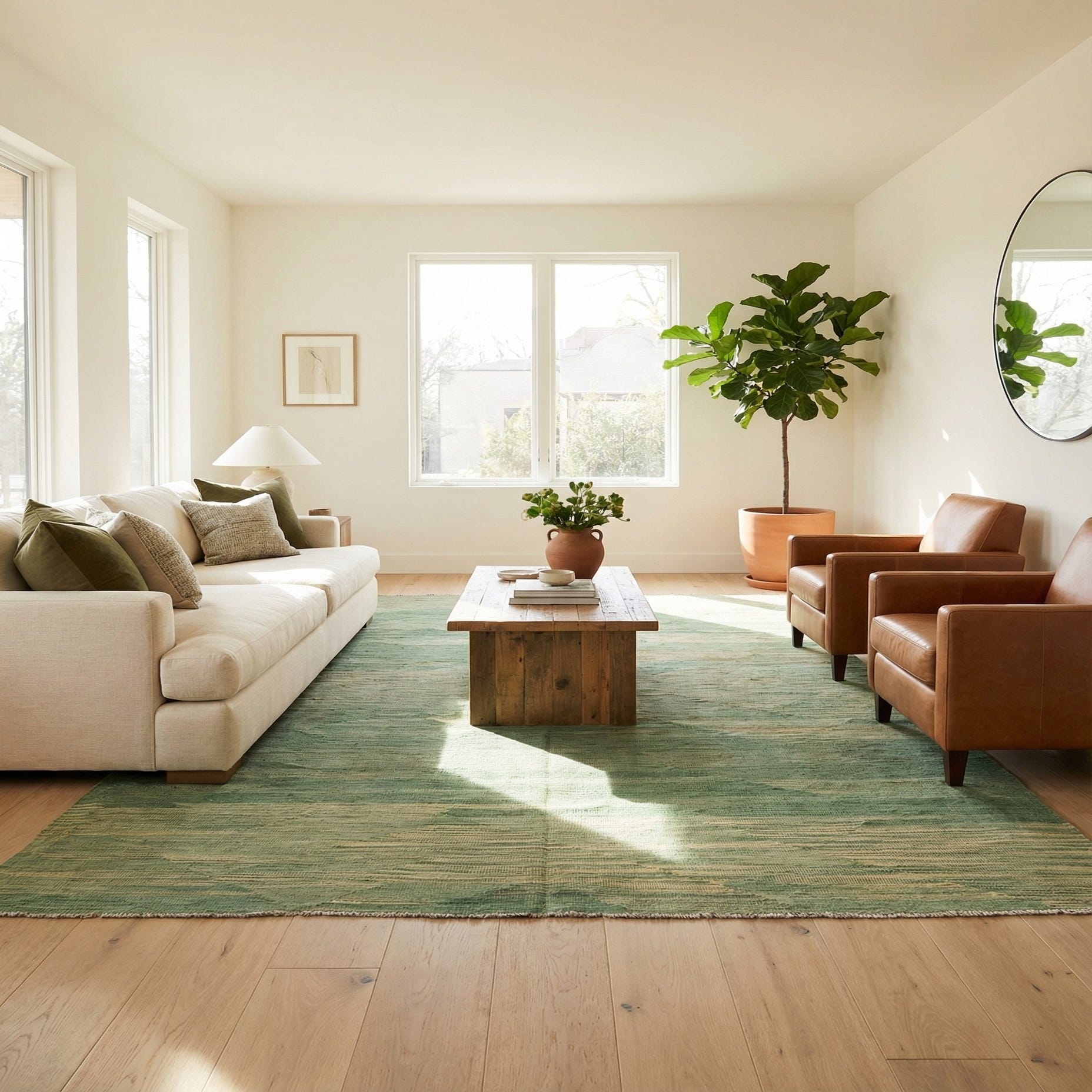 Primary color is Green. Colors in this rug include: Green, Beige.