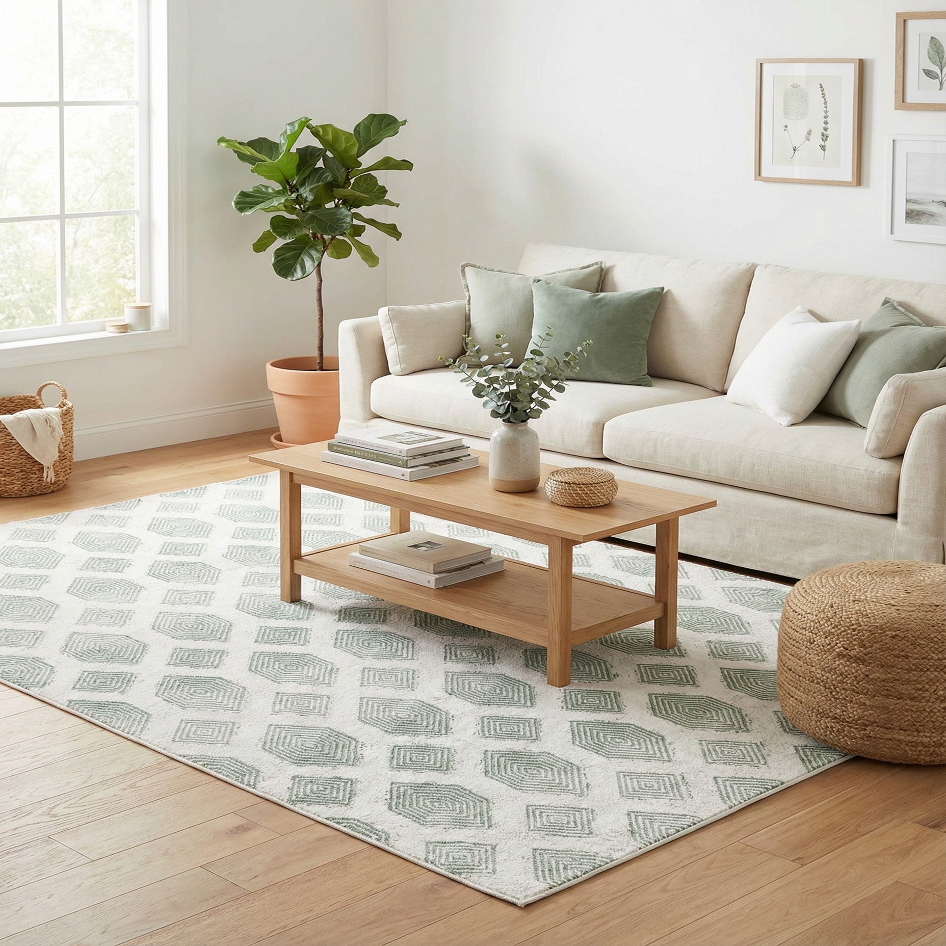 Primary color is Green. Colors in this rug include: Green, Ivory.