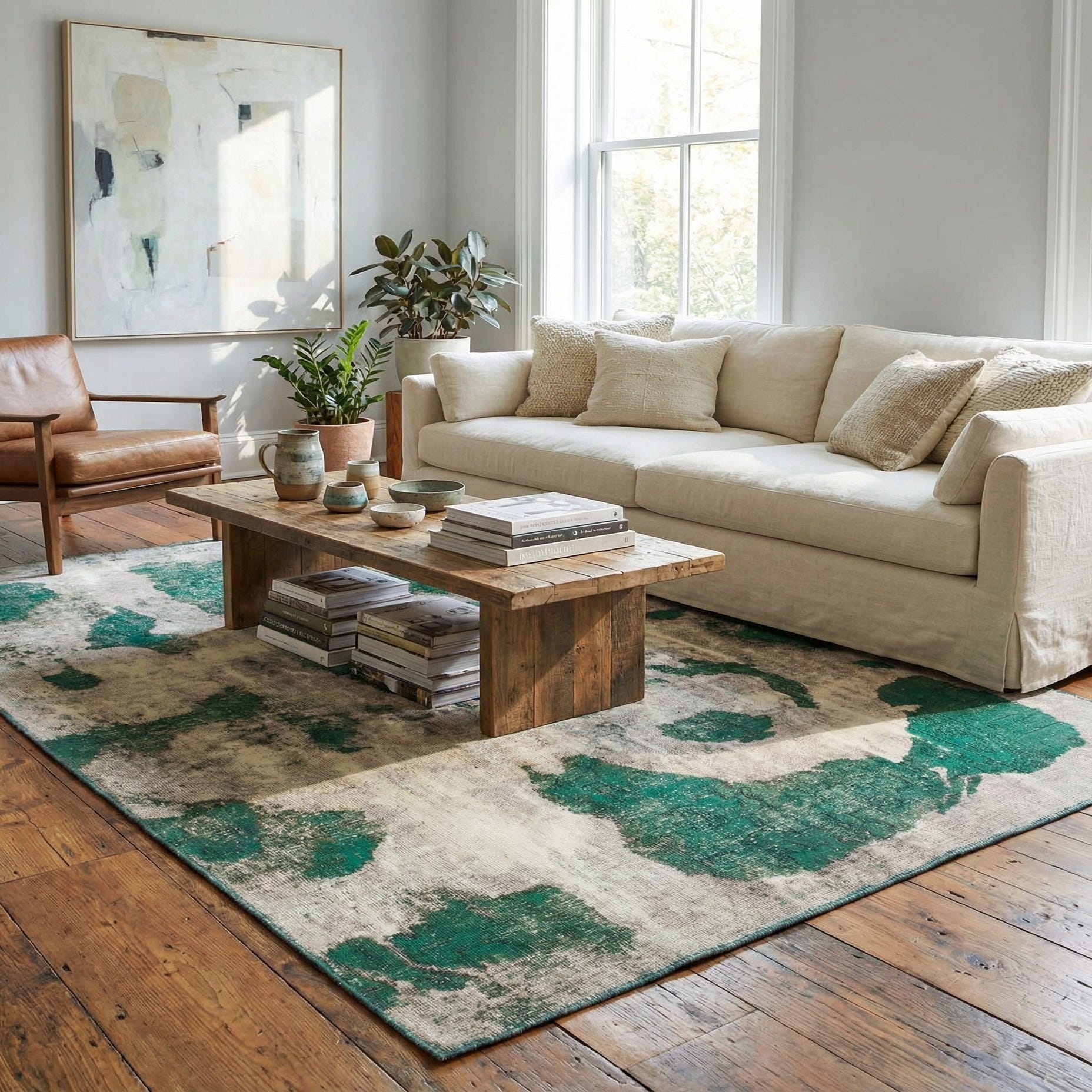 Primary color is Green. Colors in this rug include: Green, Beige, Brown, Navy Blue.
