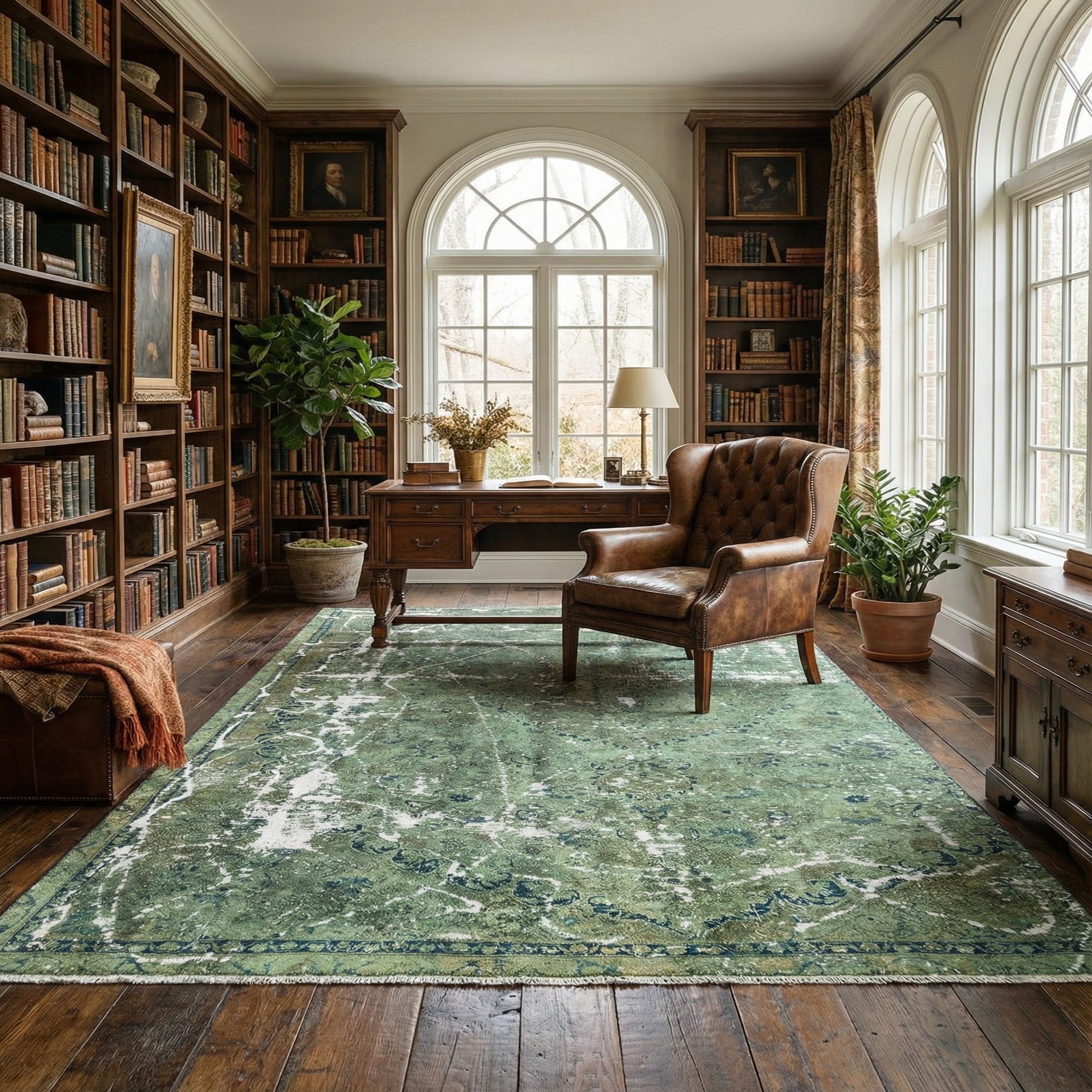 Primary color is Green. Colors in this rug include: Green, White, Dark Green.