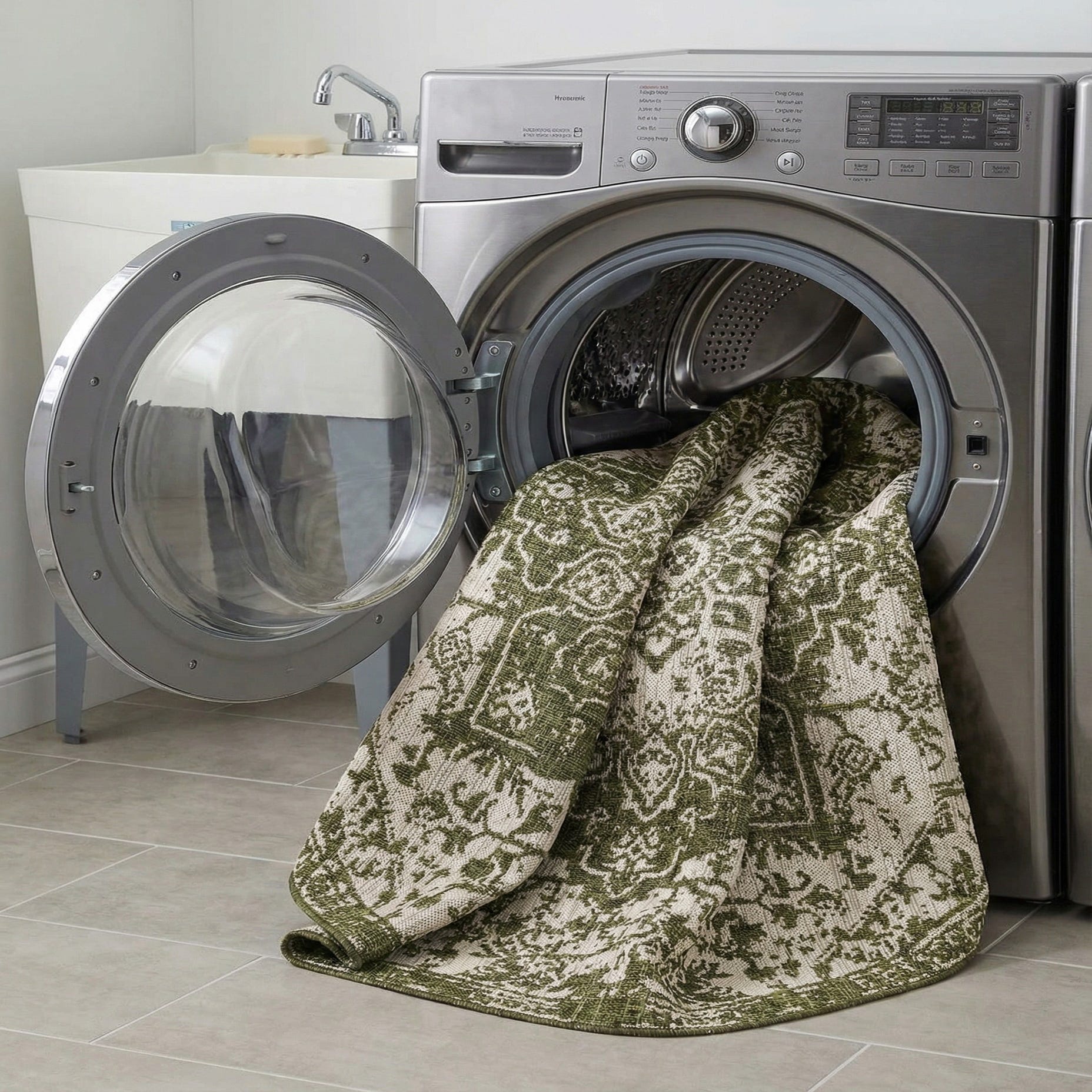 Primary color is Green. Colors in this rug include: Green, Ivory.