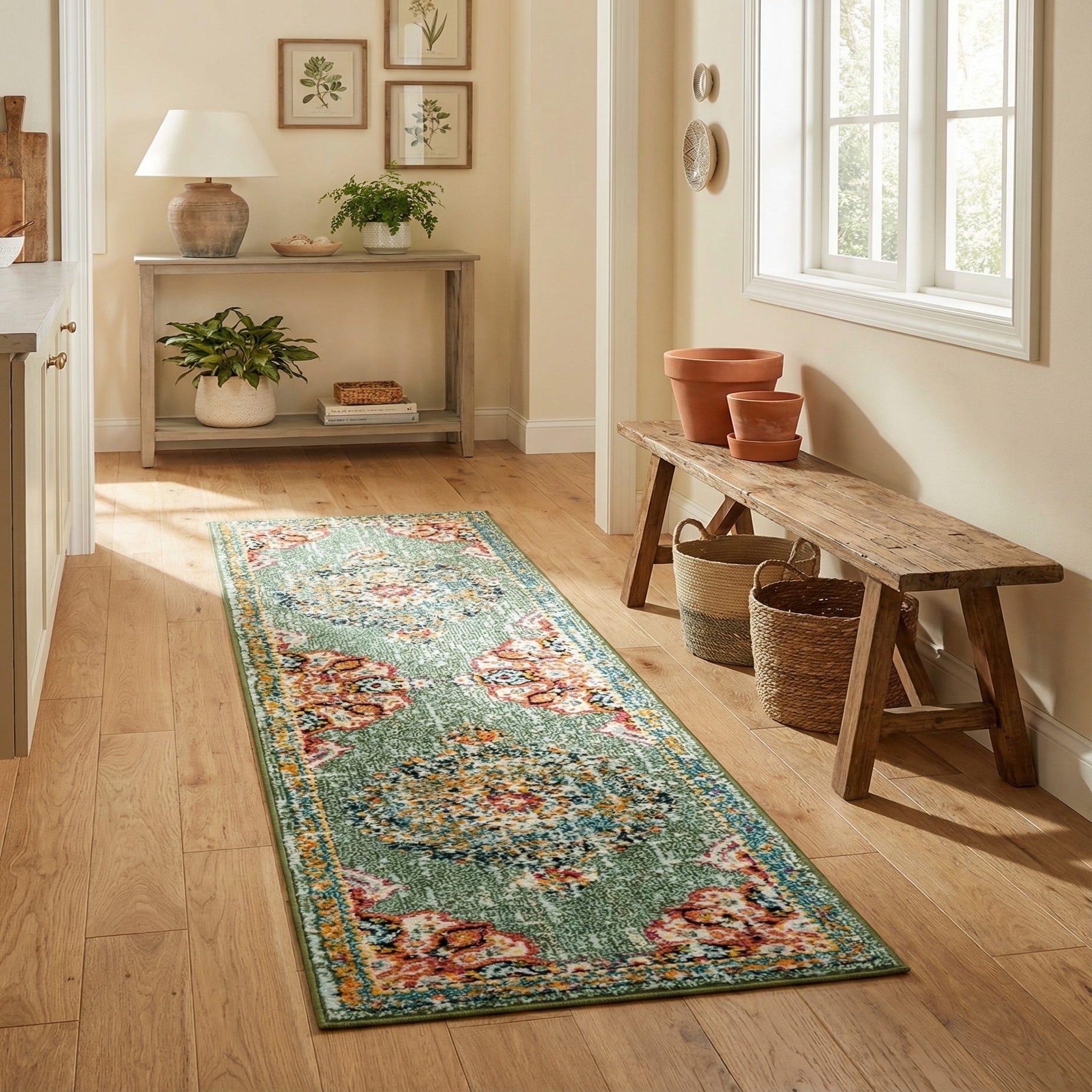 Primary color is Green. Colors in this rug include: Green, Beige, Blue, Ivory, Olive, Orange, Red, Yellow, Pink.