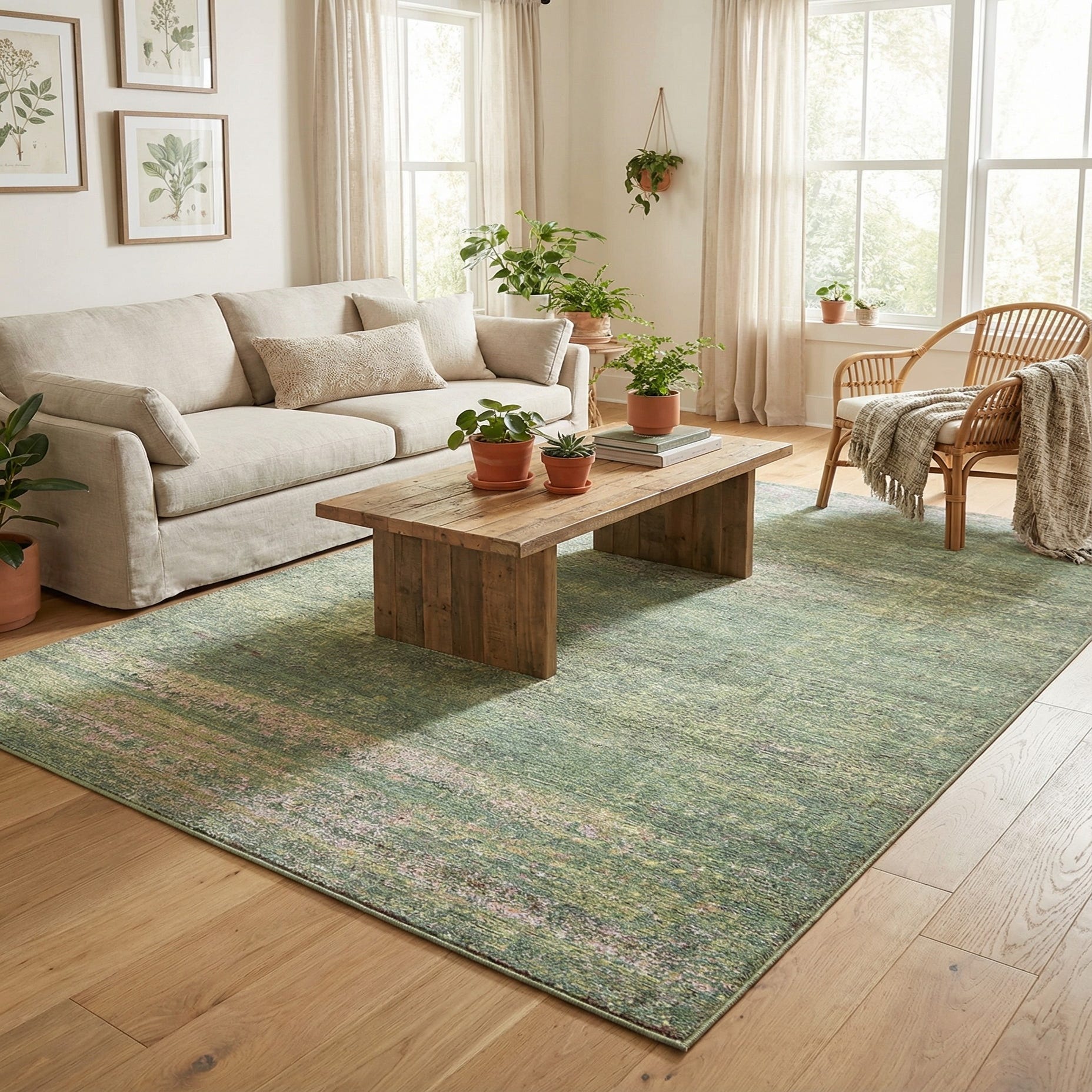 Primary color is Green. Colors in this rug include: Green, Beige, Light Blue, Olive, Orange, Red, Burgundy, Yellow.