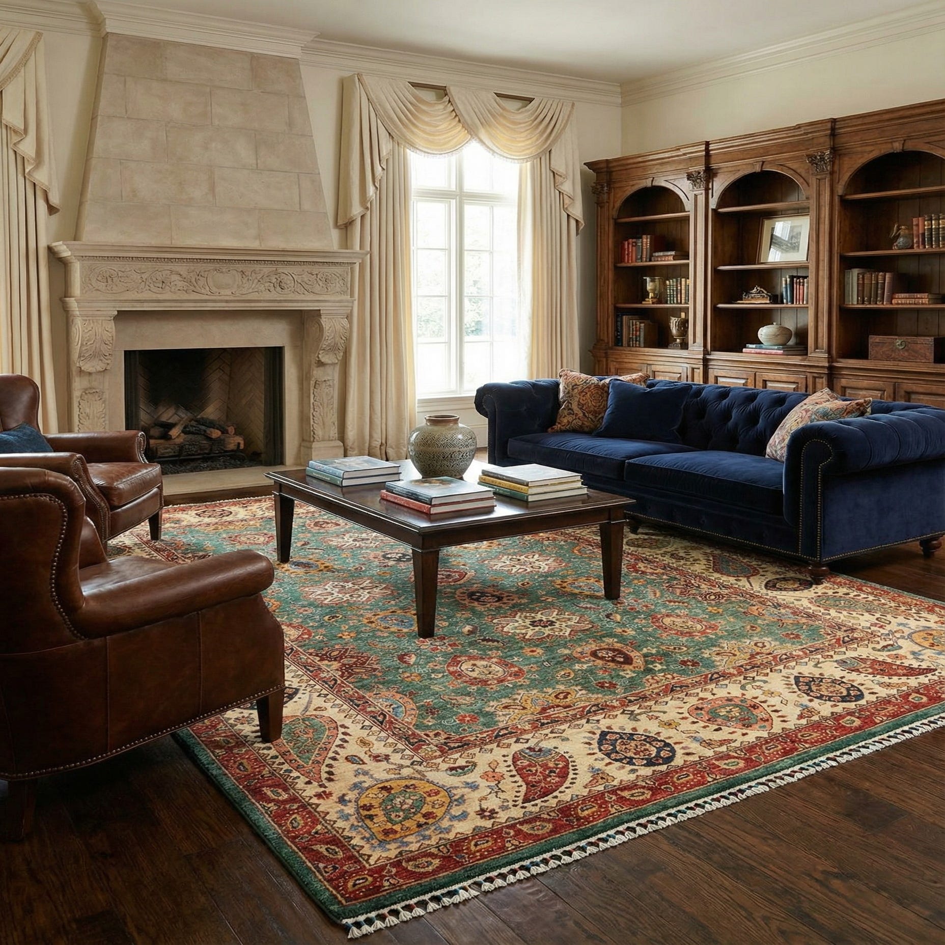 Primary color is Green. Colors in this rug include: Green, Beige, Red, Blue, Orange.