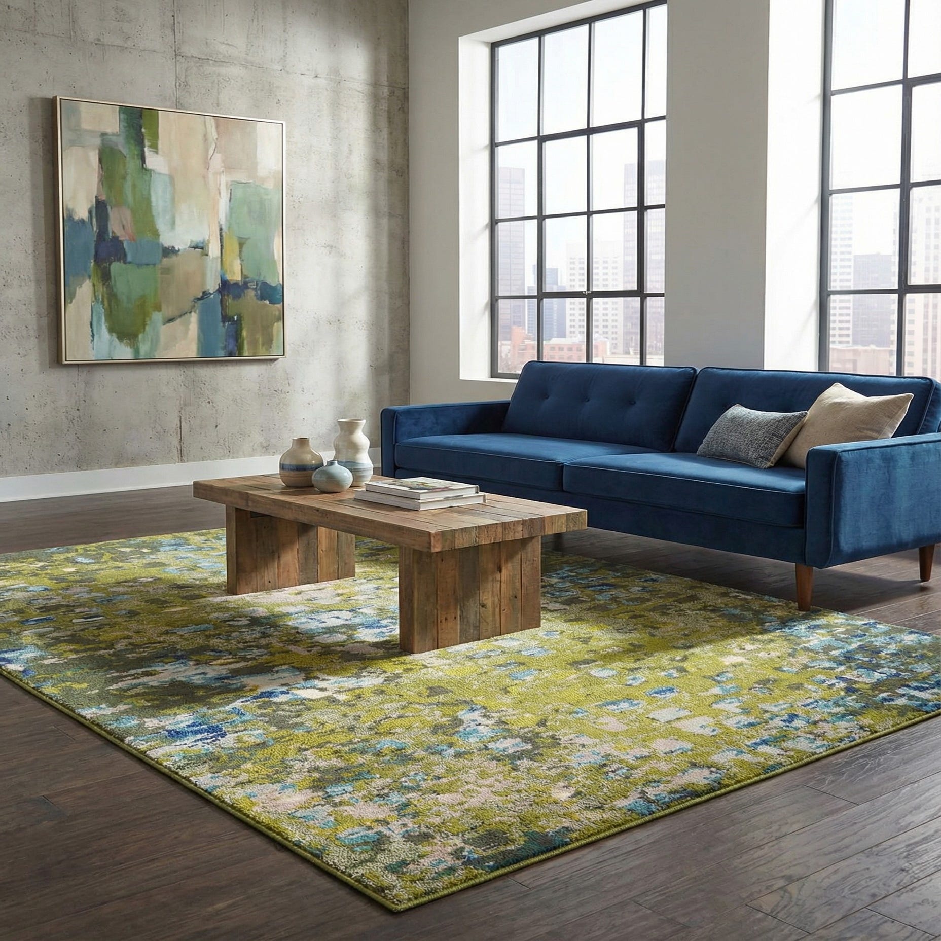 Primary color is Green. Colors in this rug include: Green, Beige, Blue, Gray, Light Blue, Light Green, Yellow.