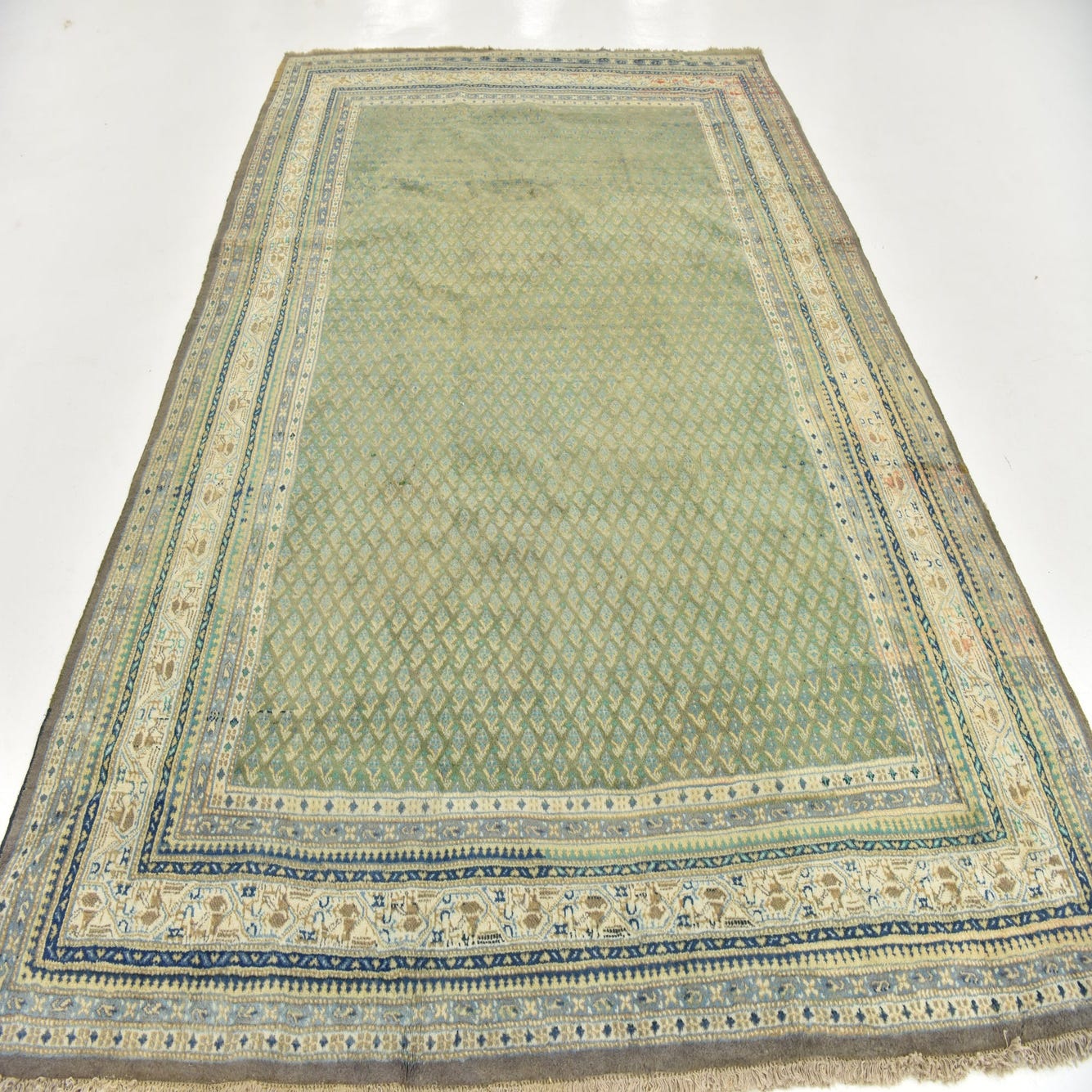 Primary color is Green. Colors in this rug include: Green, Beige, Brown, Blue, Gray, Ivory, Navy Blue.