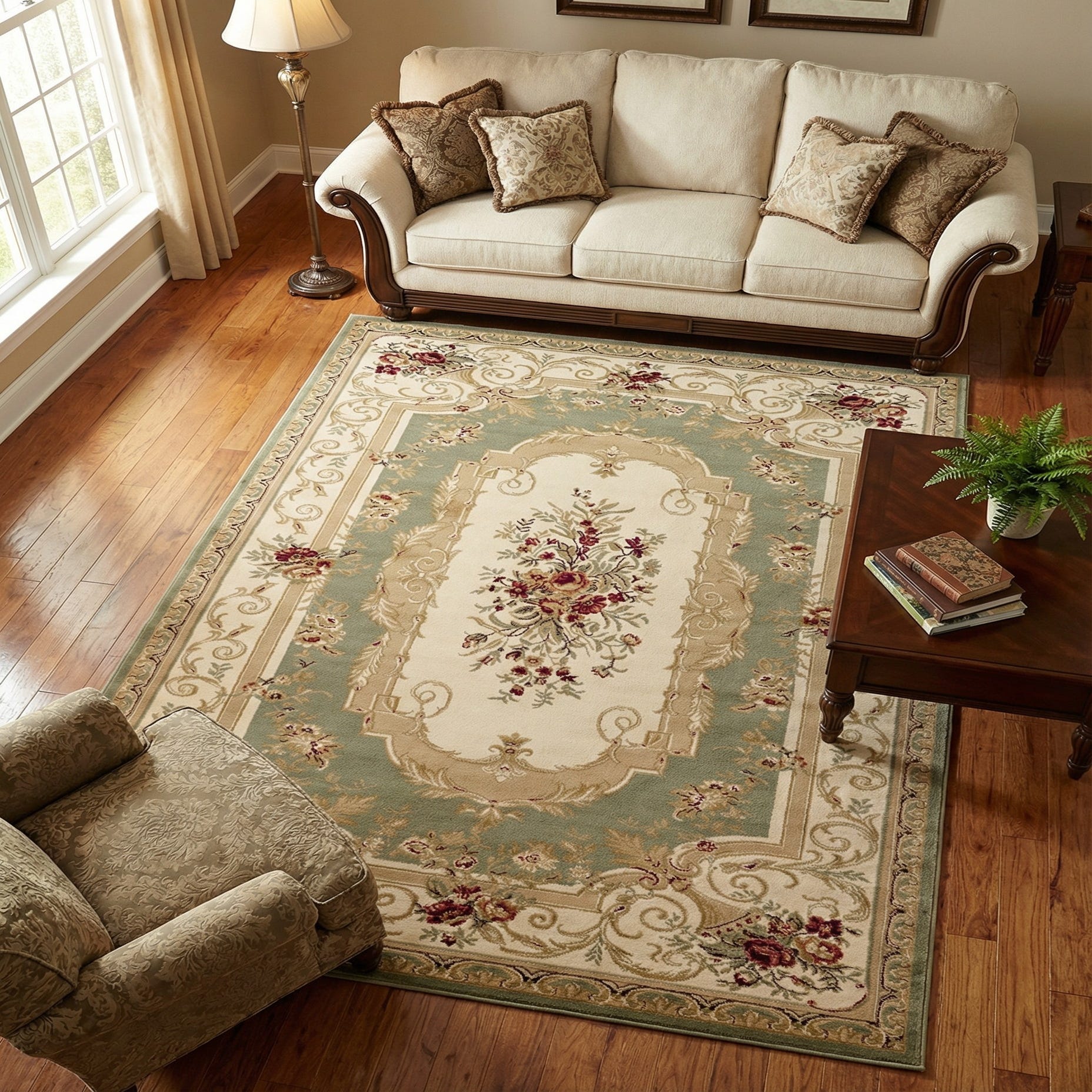 Primary color is Green. Colors in this rug include: Green, Brown, Cream, Tan, Red, Rust Red.