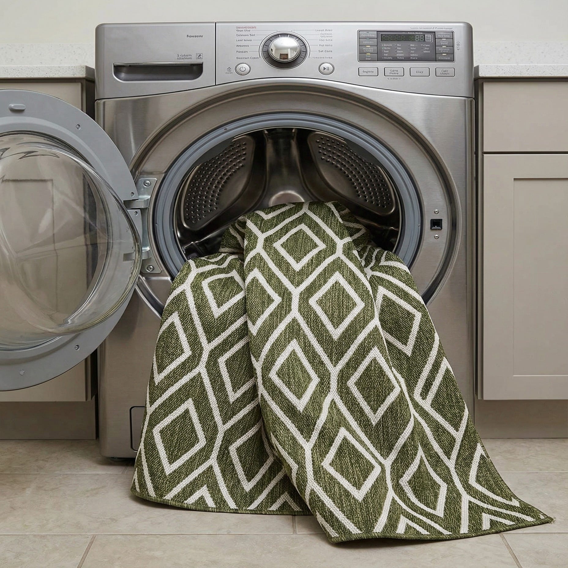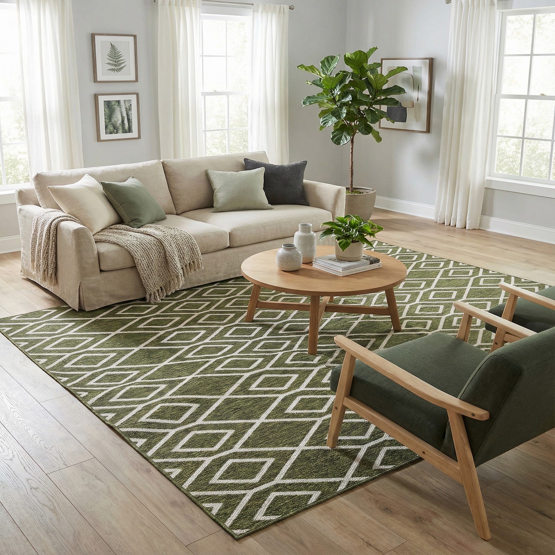 Primary color is Green. Colors in this rug include: Green, Ivory.