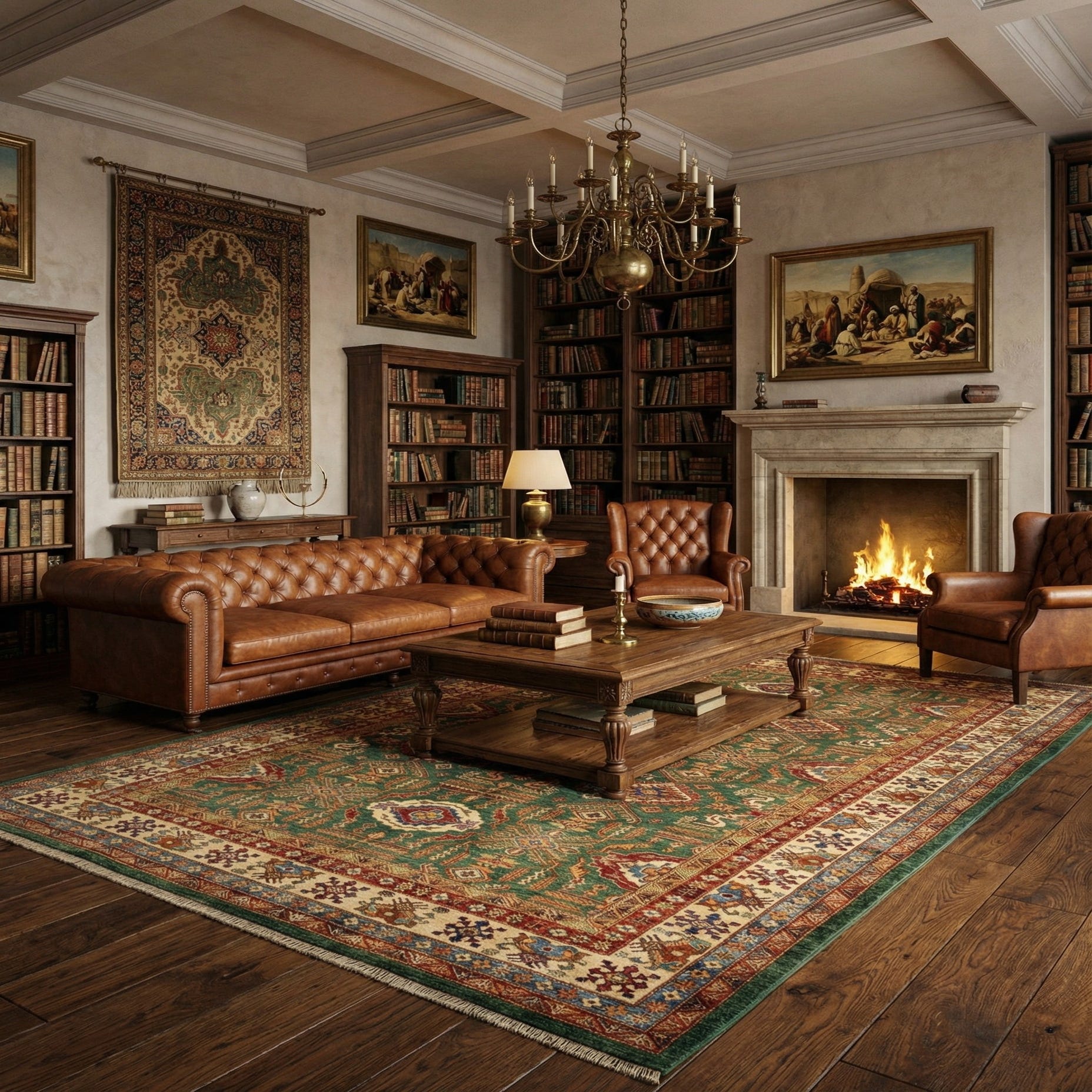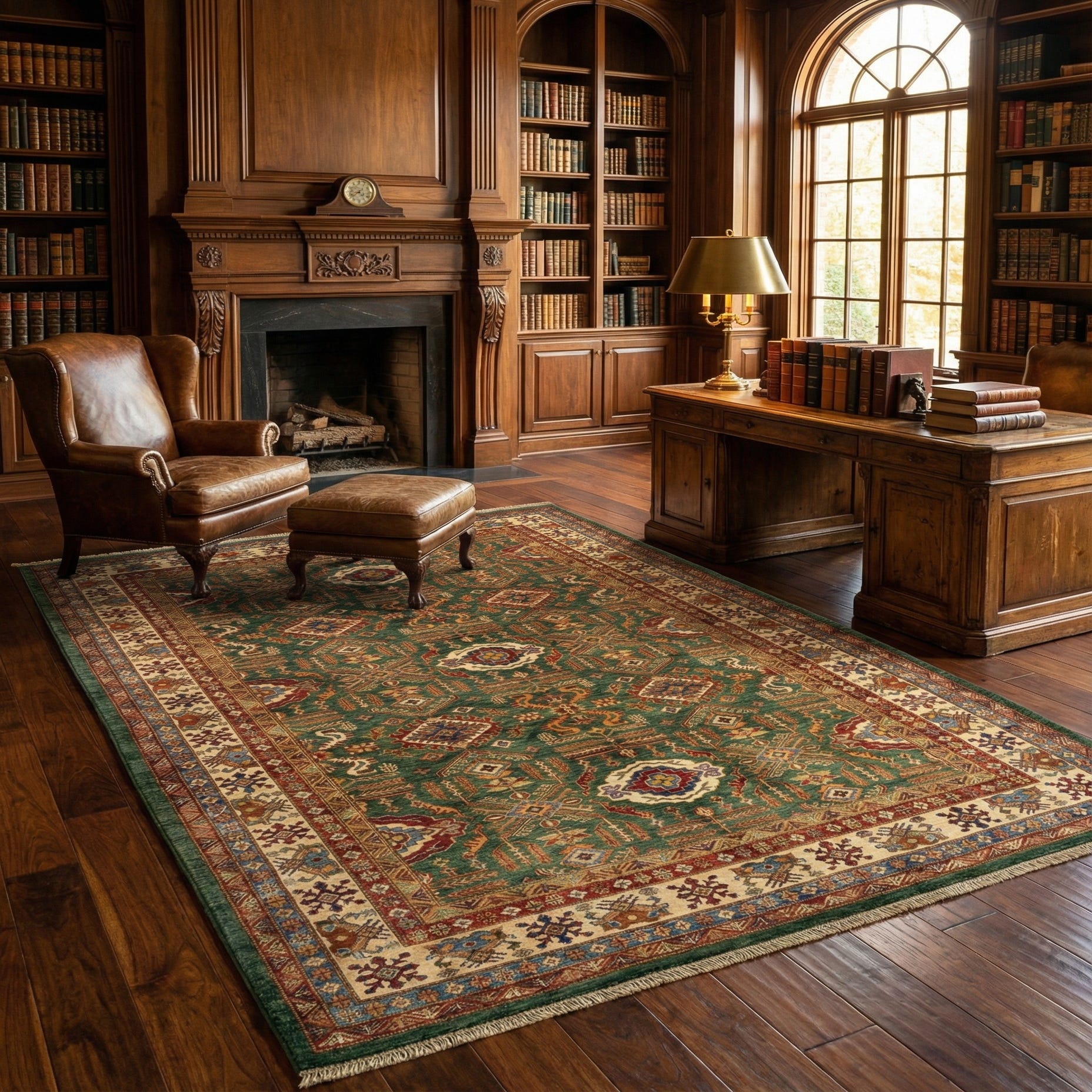 Primary color is Green. Colors in this rug include: Green, Green, Red, Beige, Cream, Blue, Brown.