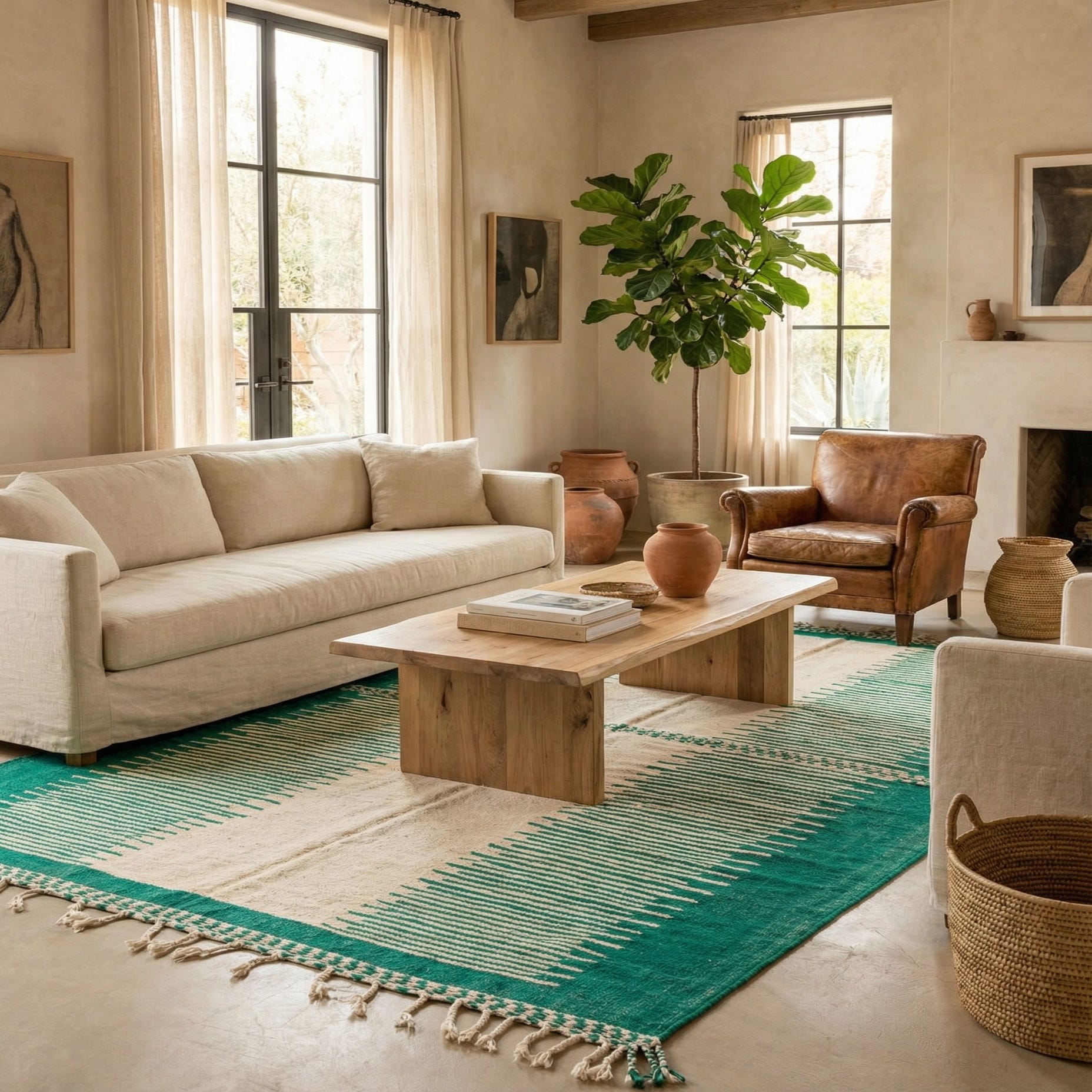 Primary color is Green. Colors in this rug include: Green, Ivory.