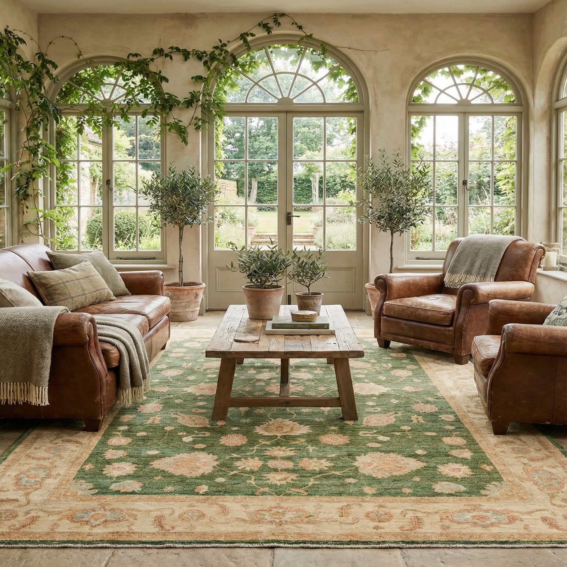Primary color is Green. Colors in this rug include: Green, Beige, Brown, Cream, Gold, Light Blue, Rust Red.