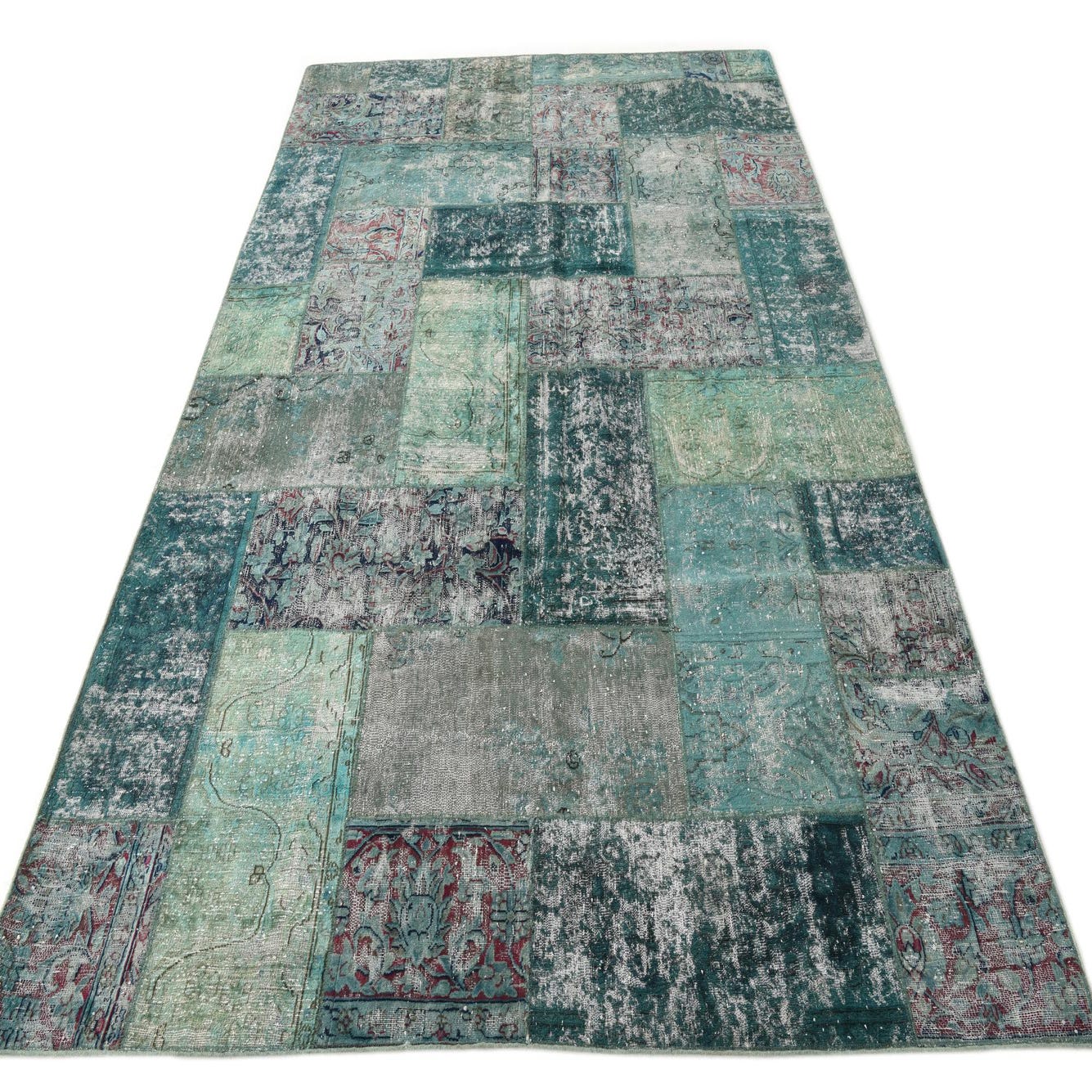 Primary color is Green. Colors in this rug include: Green, Light Green, Navy Blue, Turquoise, Burgundy, Ivory, Olive.