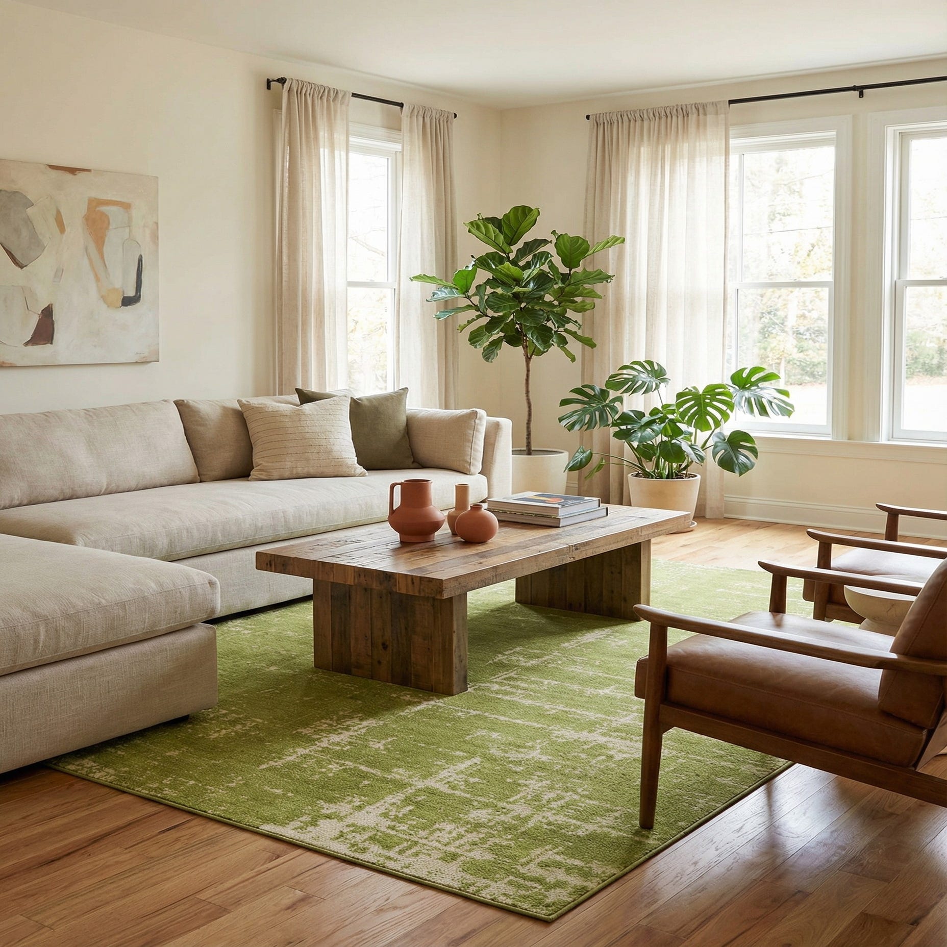 Primary color is Green. Colors in this rug include: Green, Ivory.