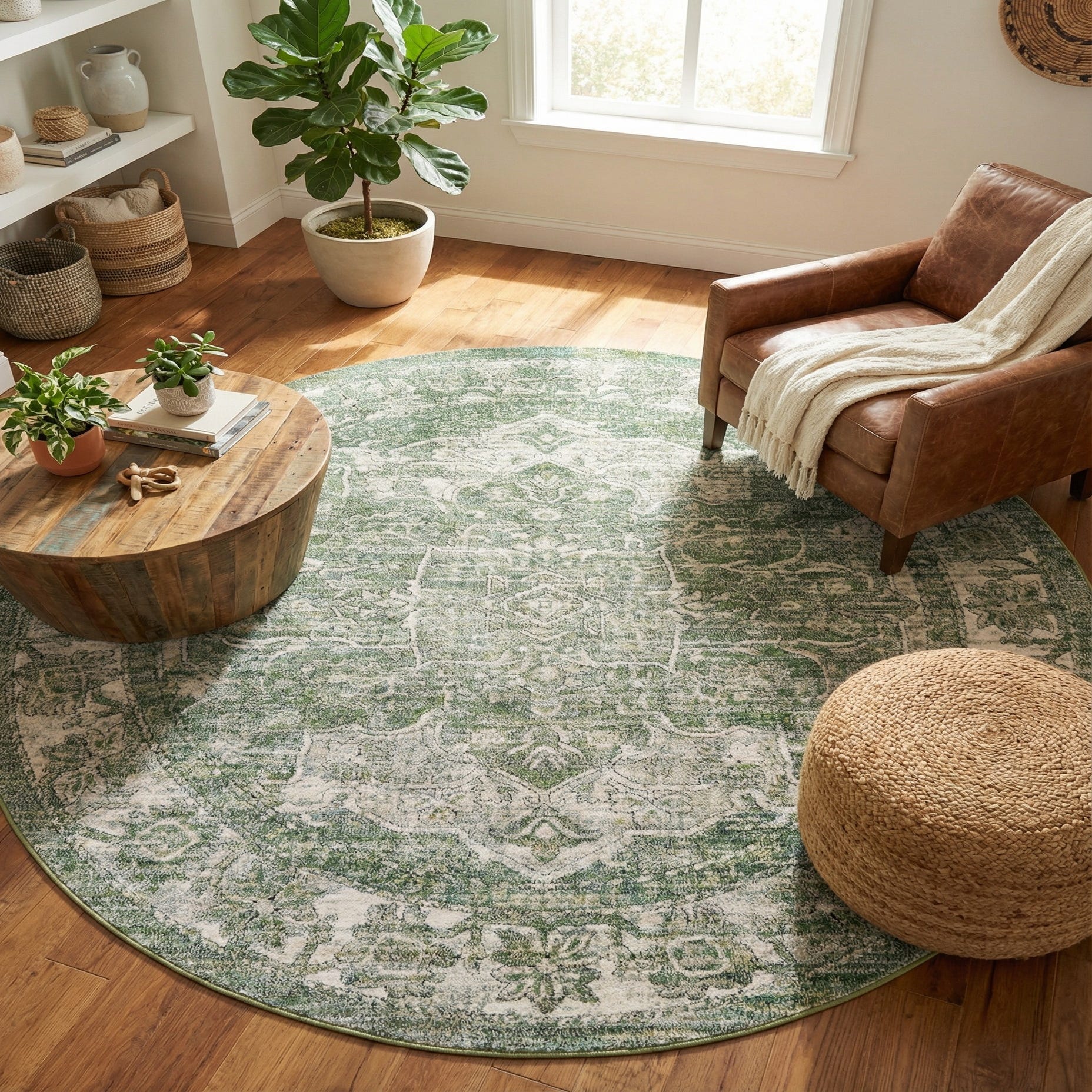 Primary color is Green. Colors in this rug include: Green, Gray, Ivory, Black, Blue.