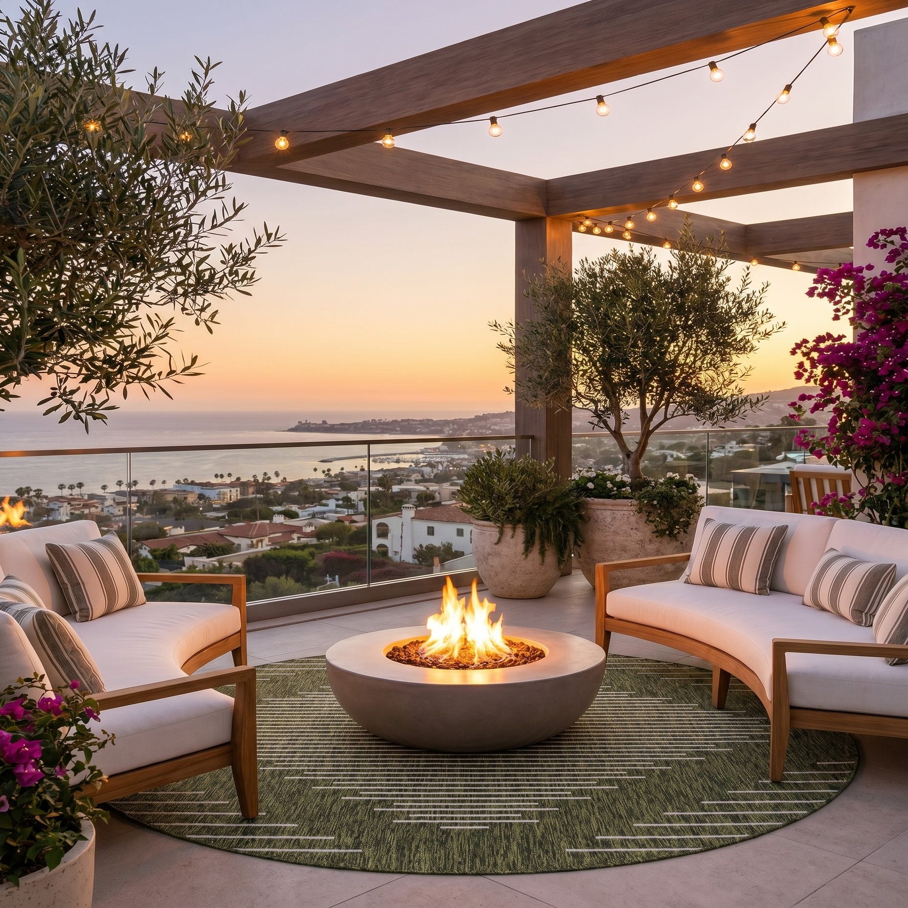 Love the contemporary look of this rug! We are so happy we chose this to accent the blue of our pool with our living area on our lanai. We still are going to add a few more pillows but love the rug to add color.