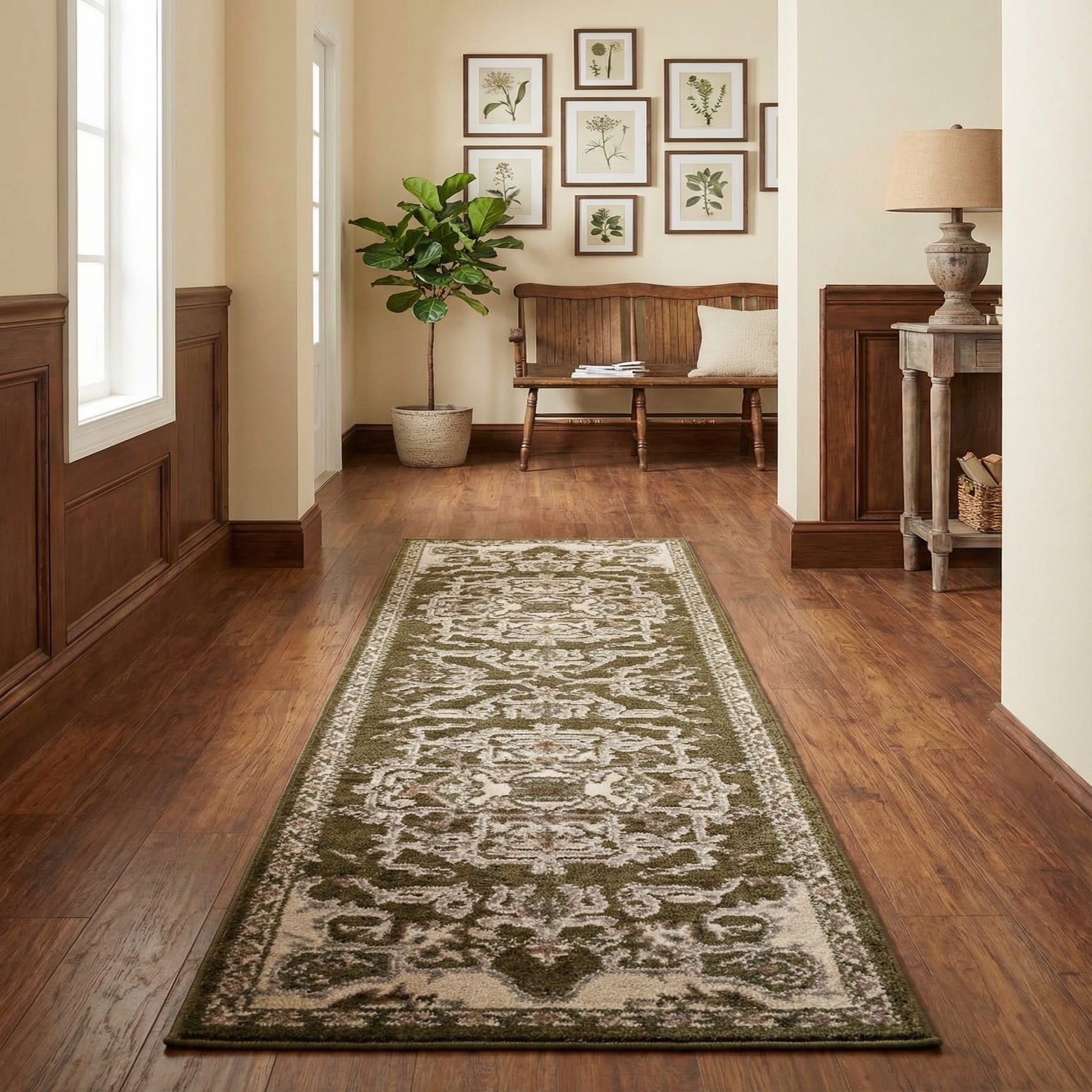 Primary color is Green. Colors in this rug include: Green, Beige, Ivory, Gray.