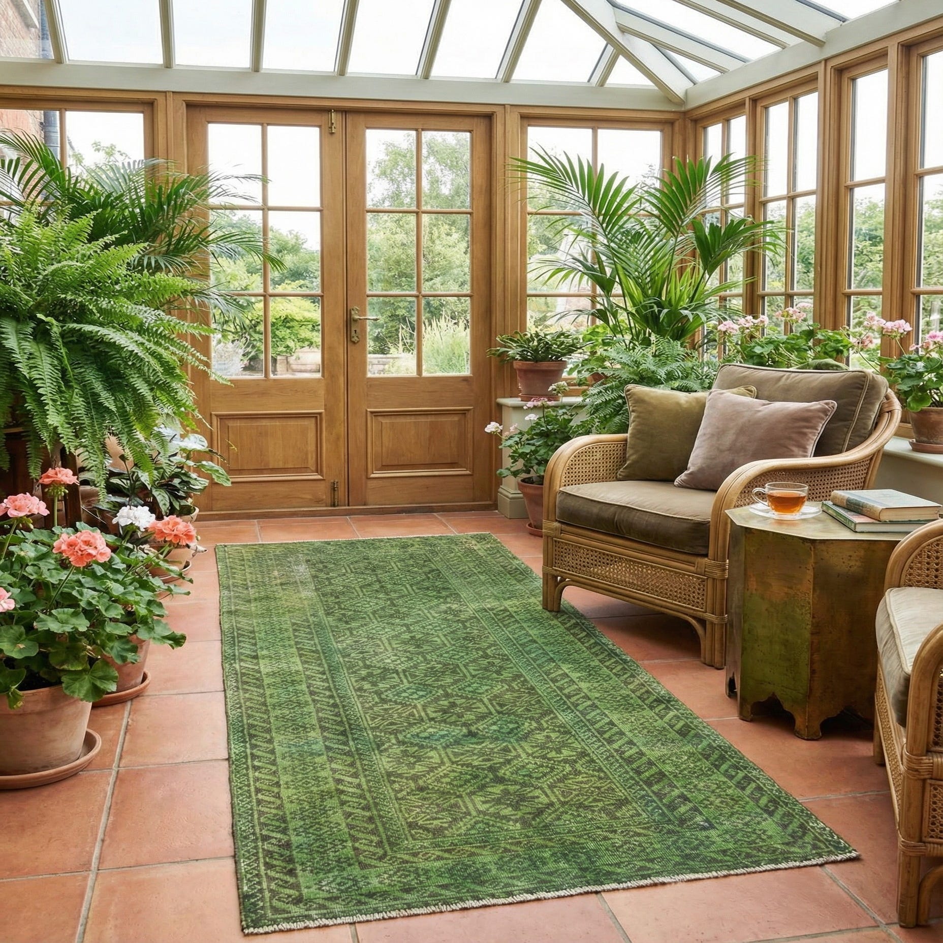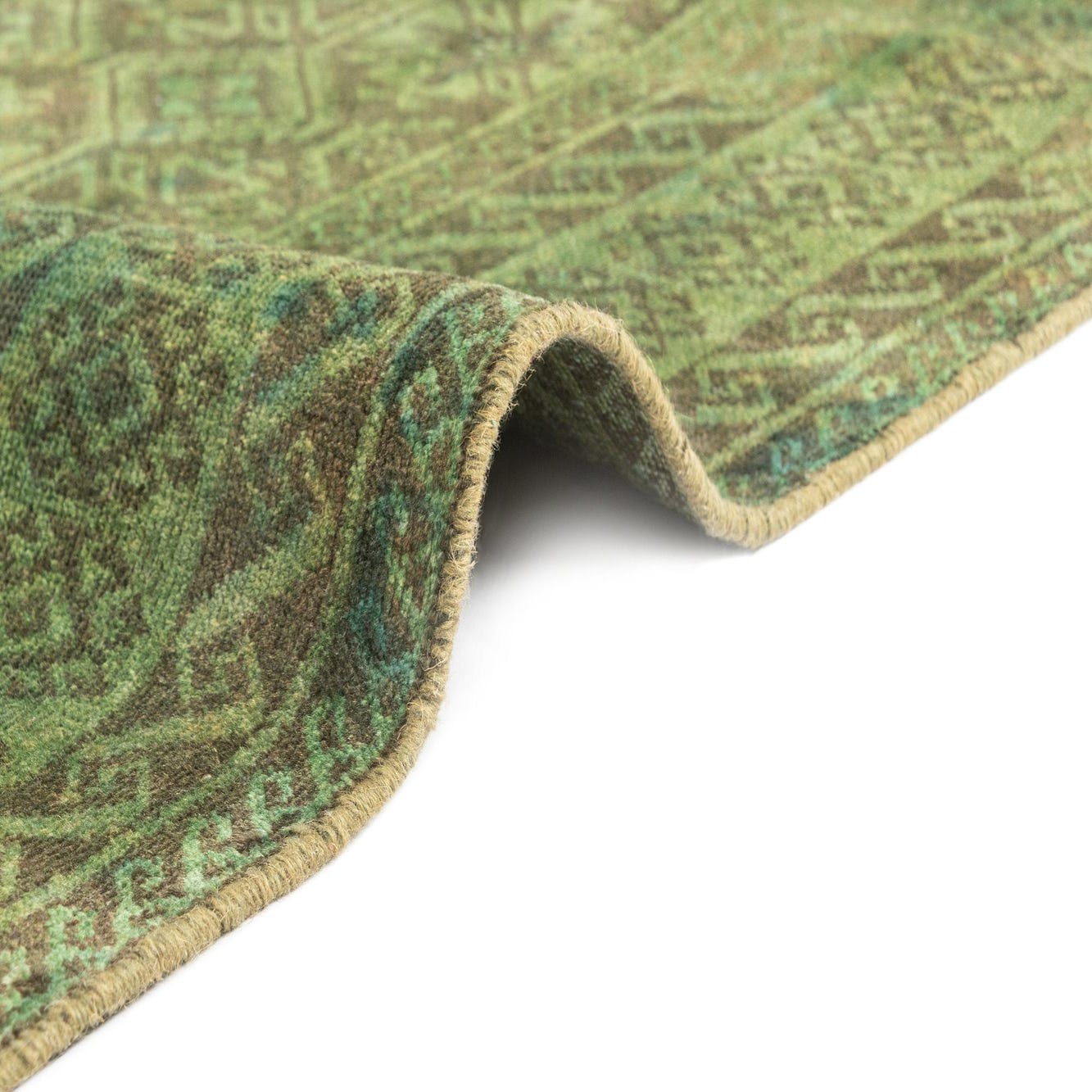 Primary color is Green. Colors in this rug include: Green, Brown.