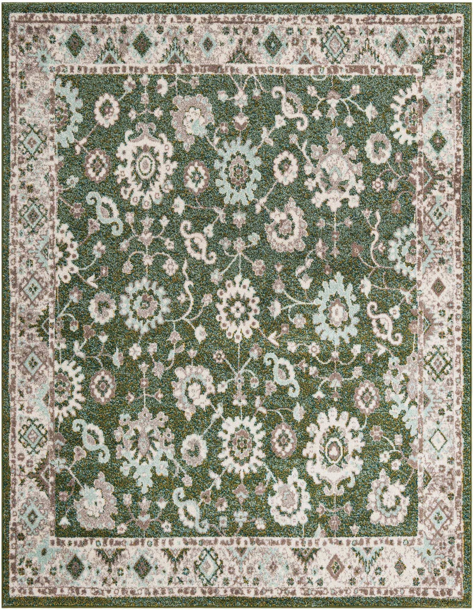 Primary color is Green. Colors in this rug include: Green, Beige, Ivory, Light Blue.