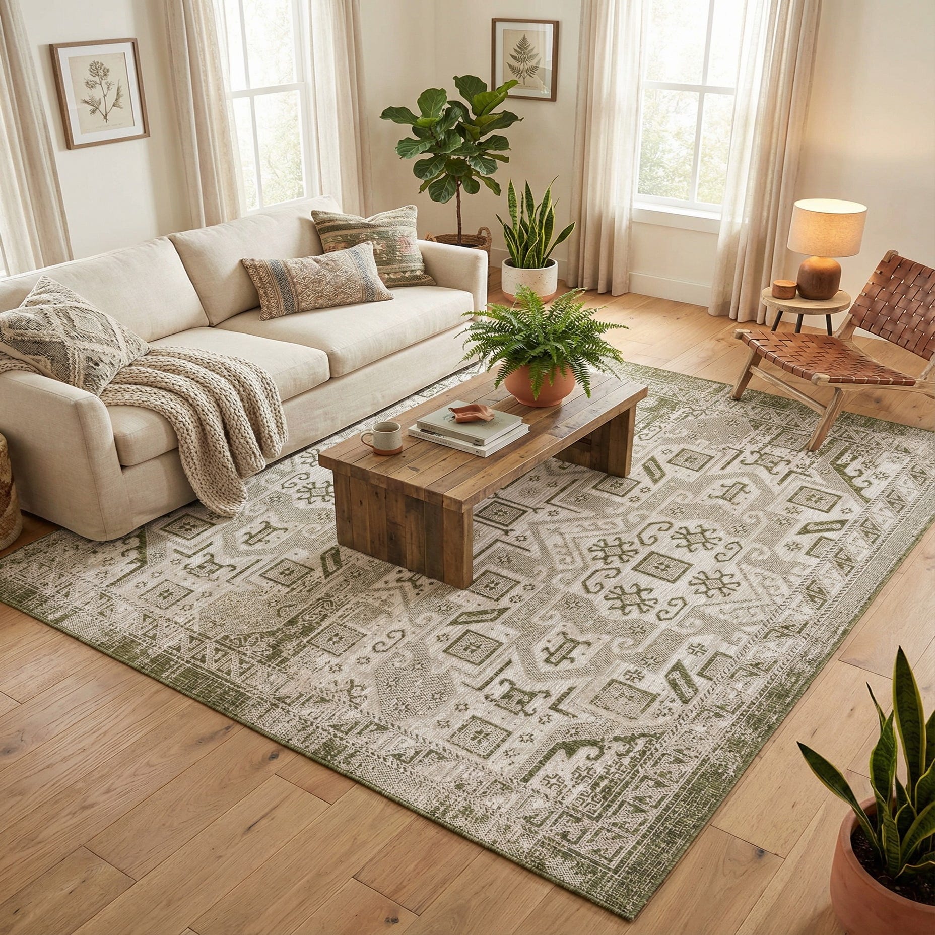 Primary color is Green. Colors in this rug include: Green, Ivory.