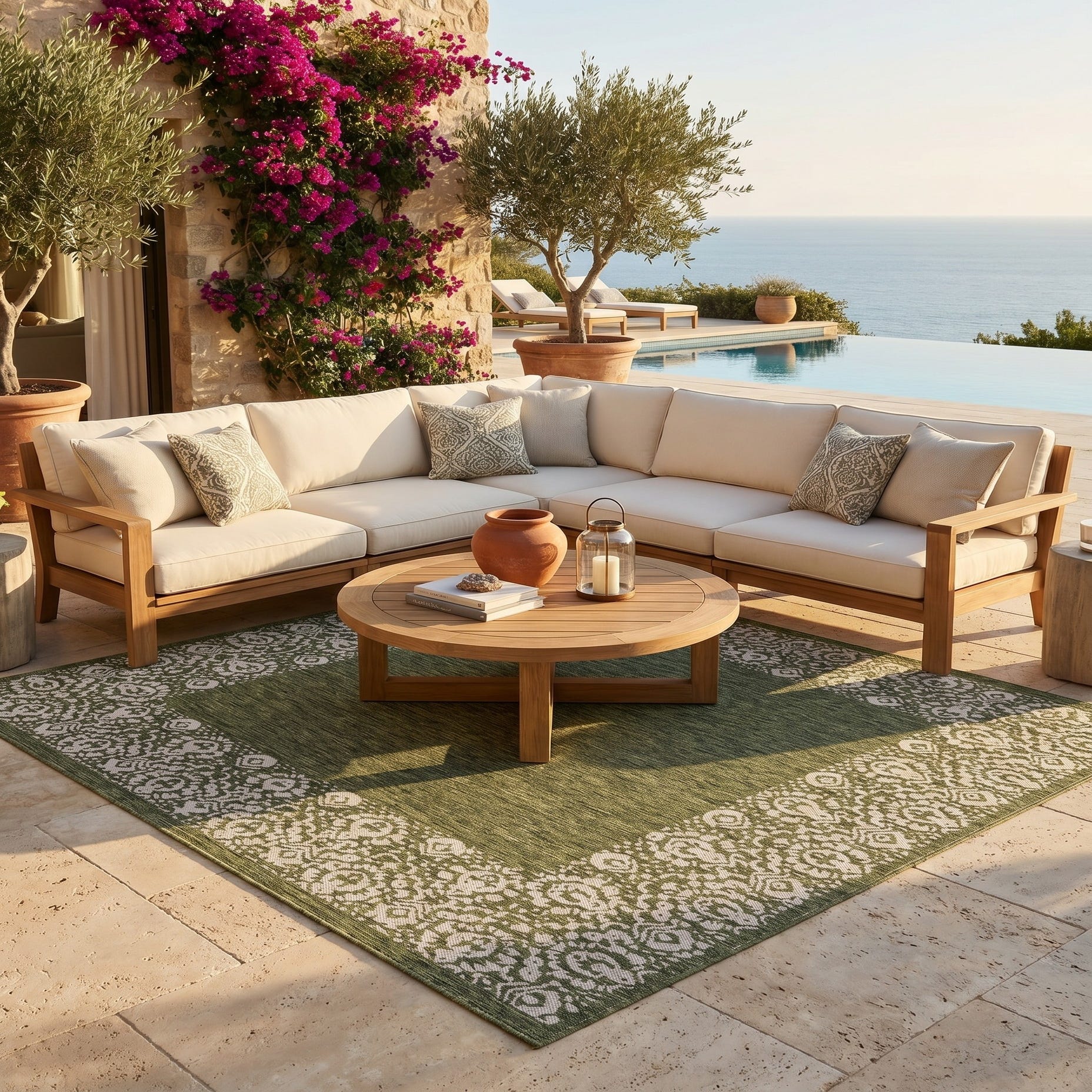 I LOVE this rug. It’s gorgeous. It fits my space perfectly and covers the imperfections of my patio that are waiting to be repaired. I’ve received so many compliments. My outdoor space has never been cozier and more for inviting. The best part is how quickly it dries after a rain. I am thoroughly impressed by the quality and craftsmanship of this rug.