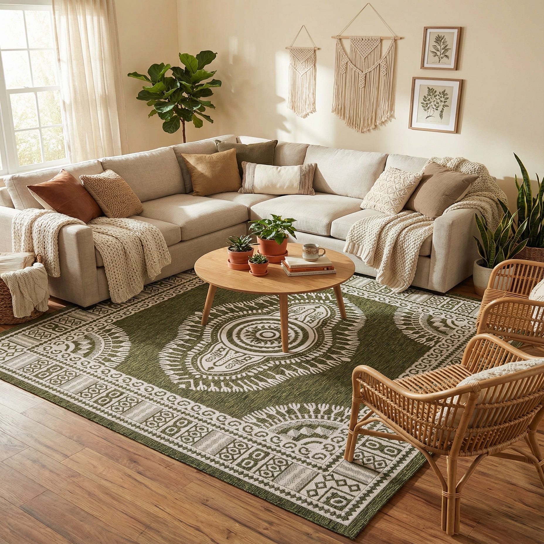 Primary color is Green. Colors in this rug include: Green, Ivory.