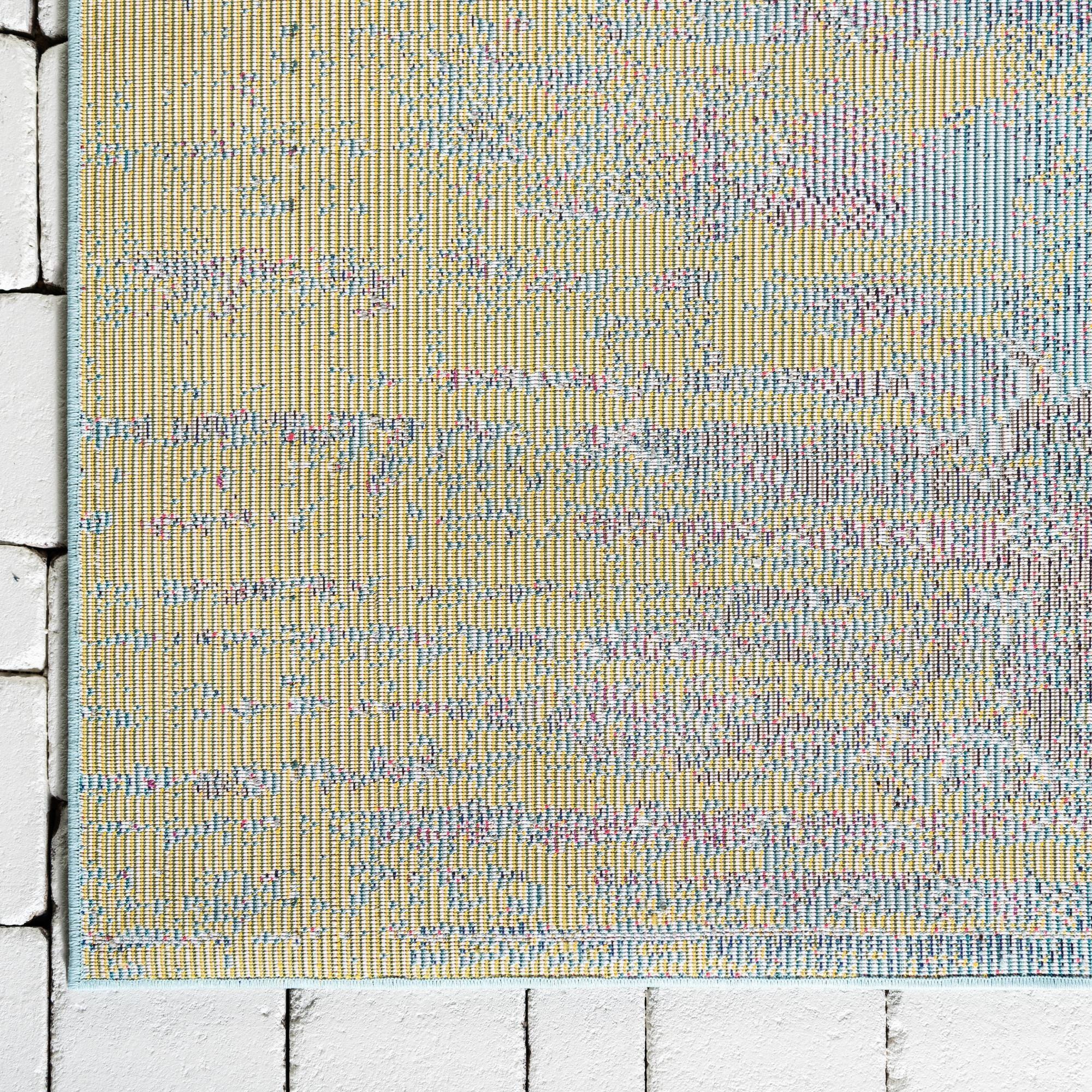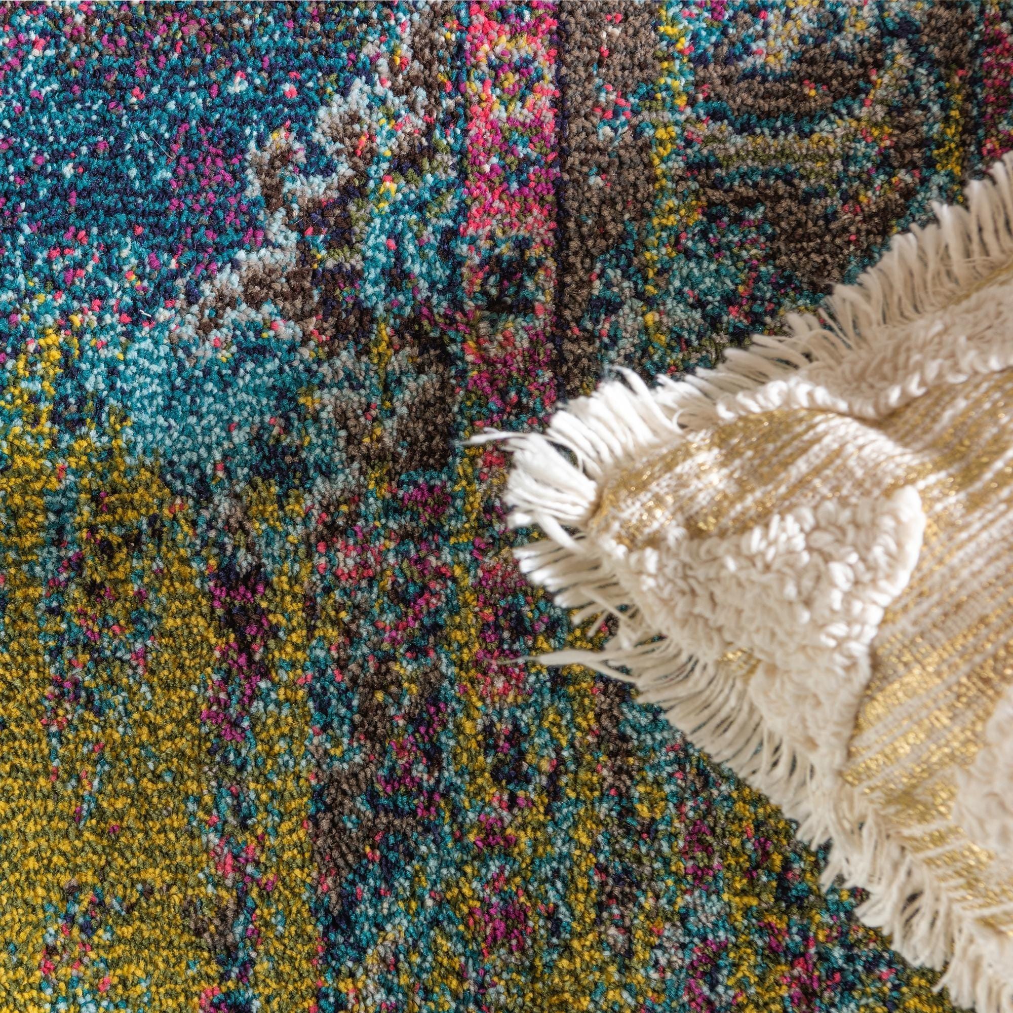 Primary color is Green. Colors in this rug include: Green, Blue, Brown, Navy Blue, Pink, Yellow.