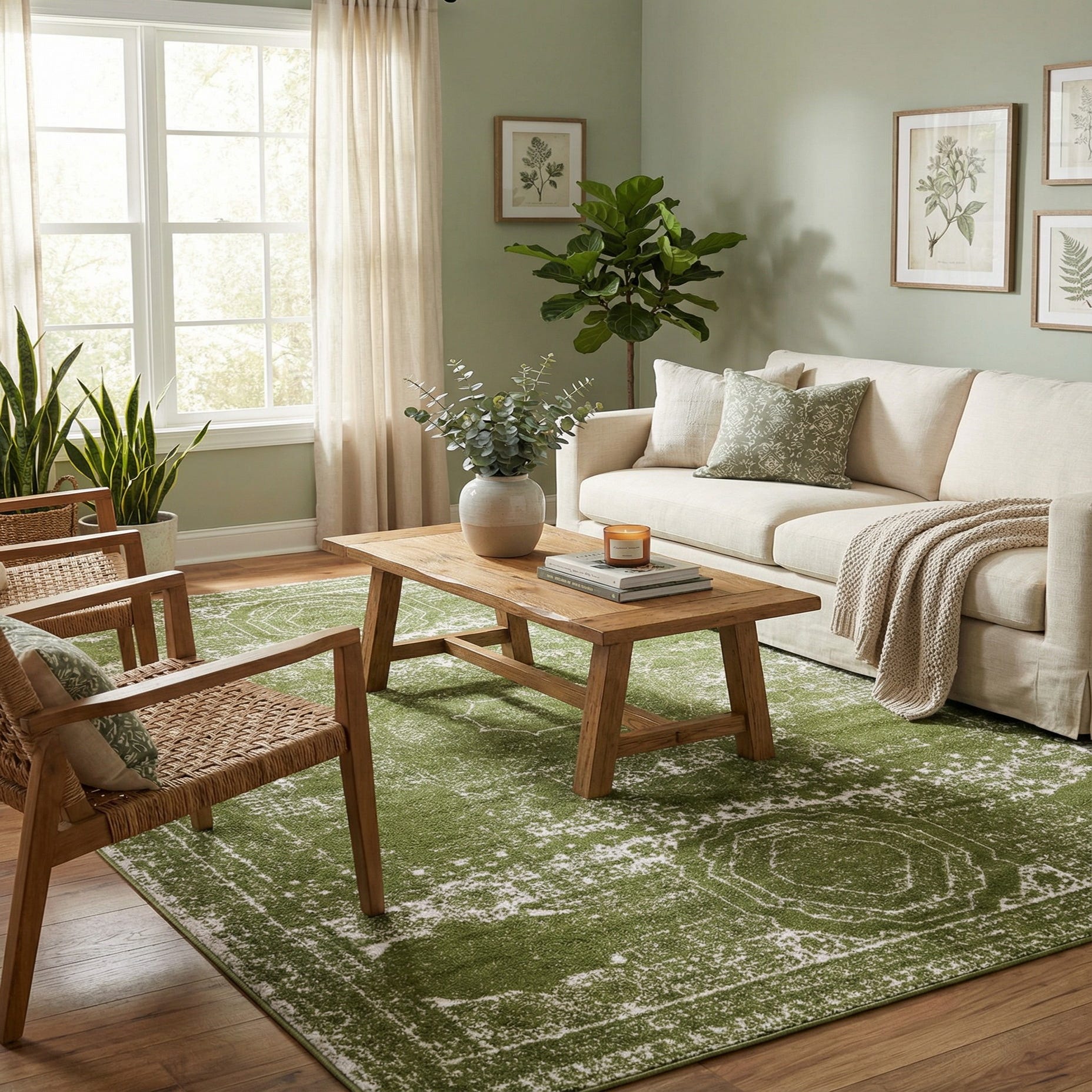 Primary color is Green. Colors in this rug include: Green, Ivory.