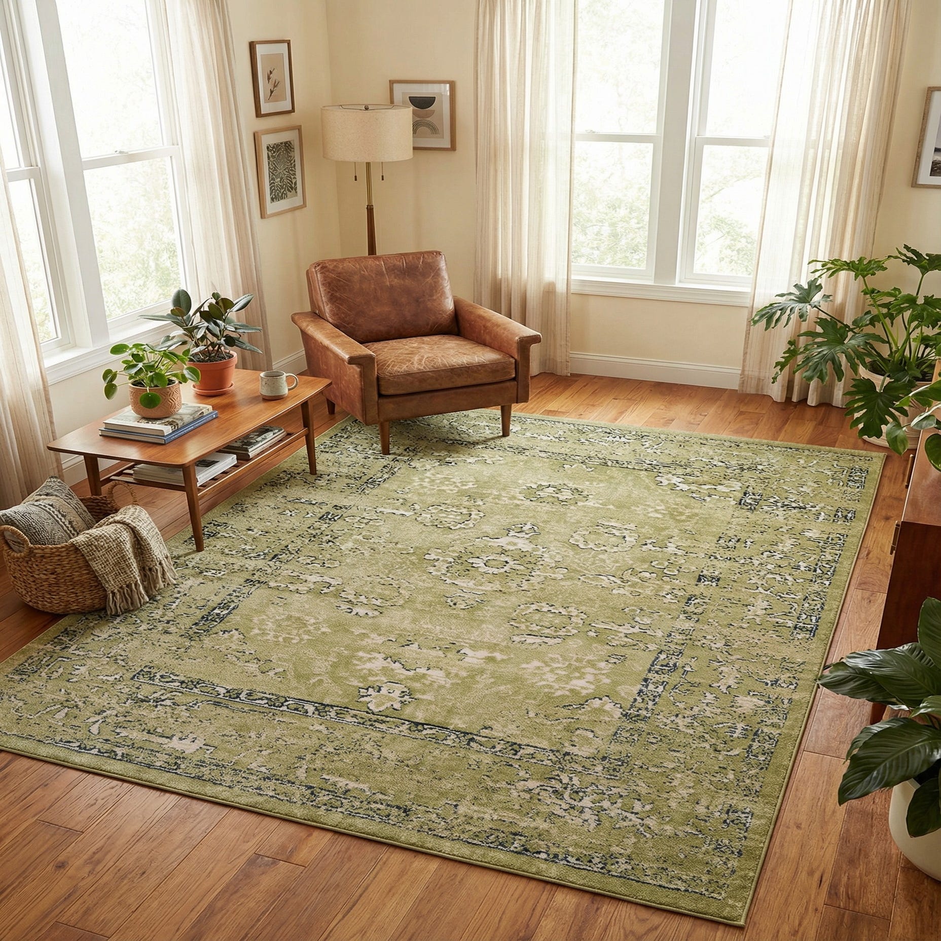 Primary color is Green. Colors in this rug include: Green, Ivory, Navy Blue.
