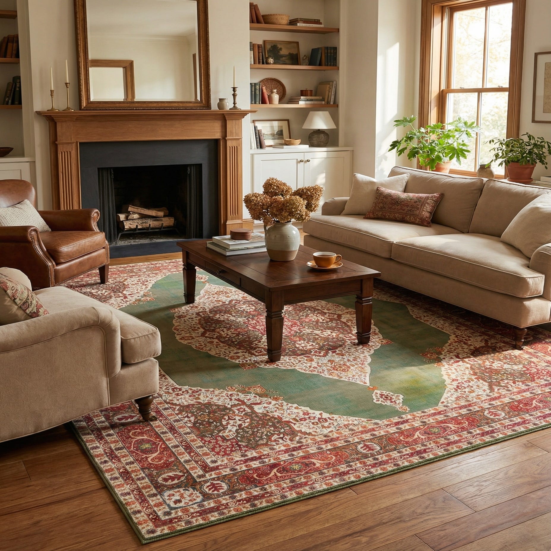 Primary color is Green. Colors in this rug include: Green, Blue, Ivory, Olive, Orange, Red, Yellow.