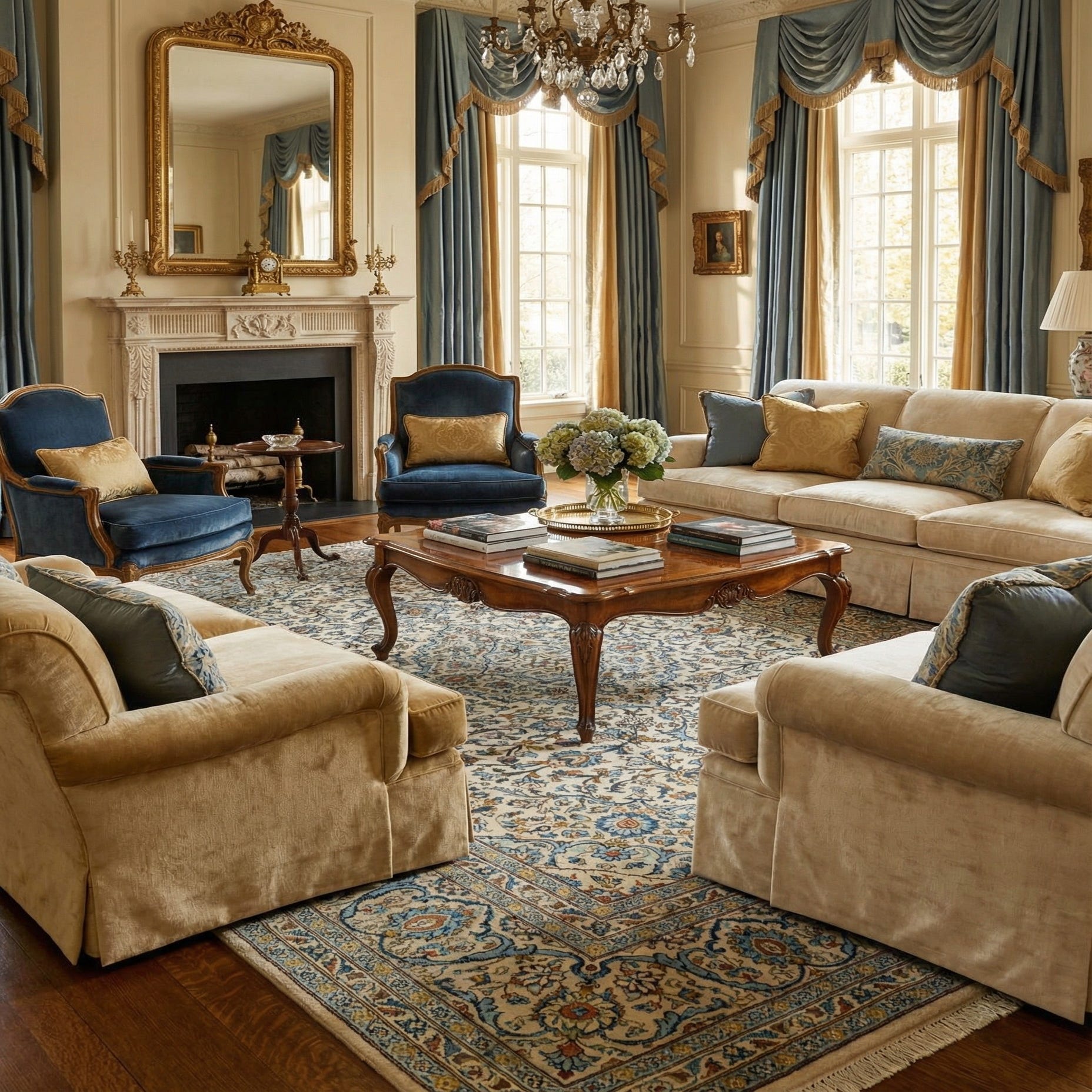 Primary color is Green. Colors in this rug include: Green, Olive, Brown, Dark Blue, Dark Grey.