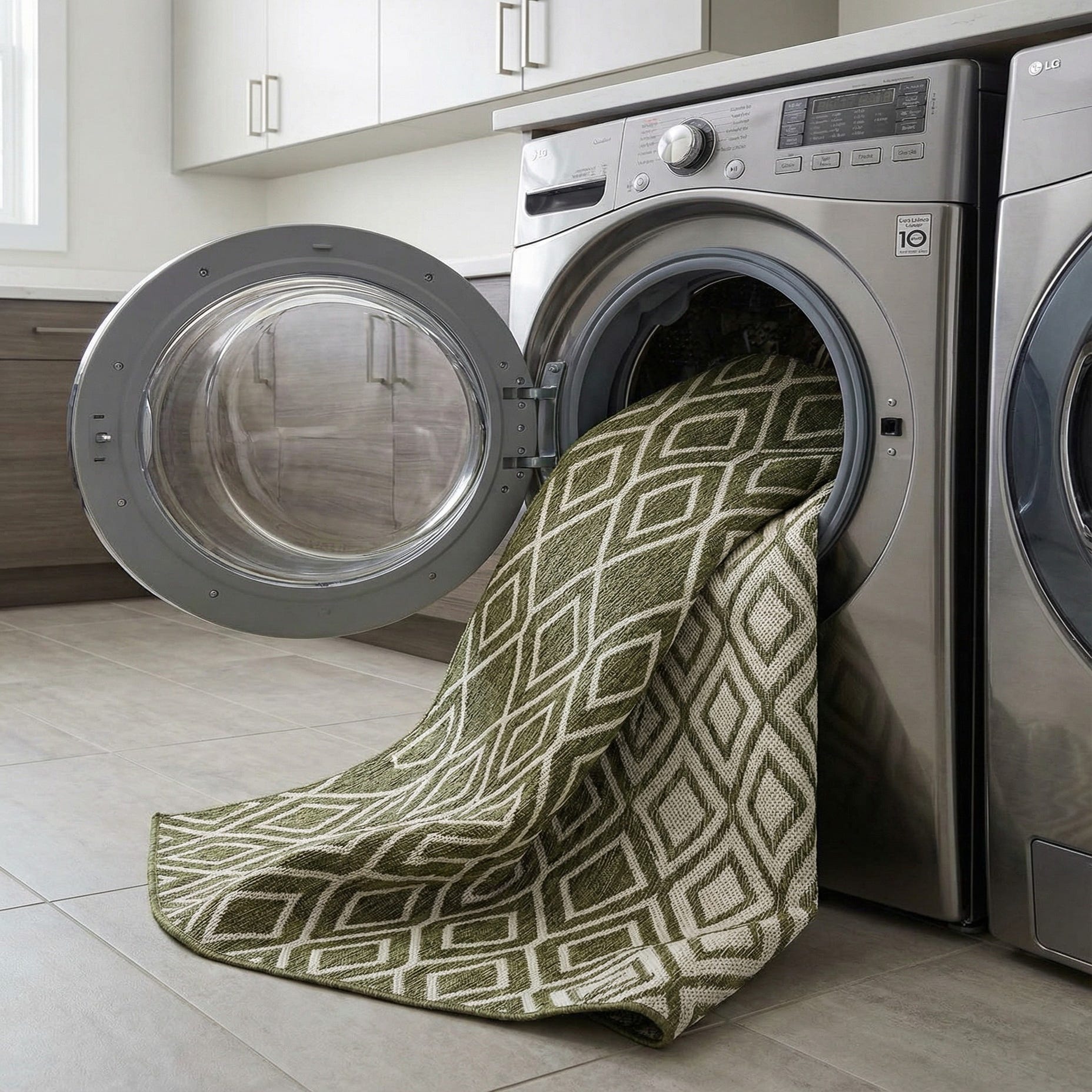 Primary color is Green. Colors in this rug include: Green, Ivory.