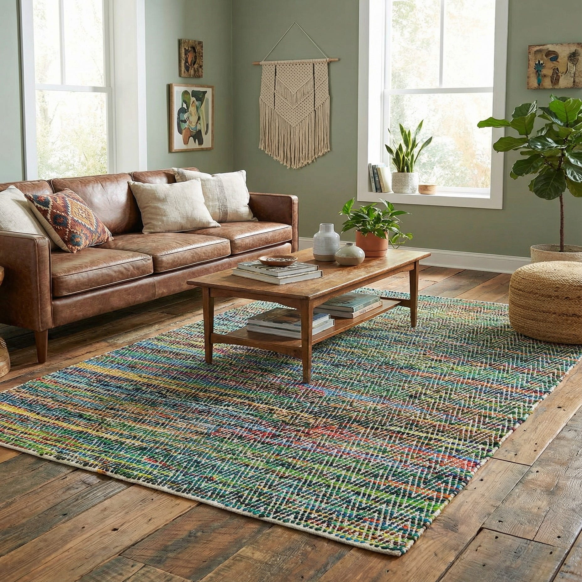 Primary color is Green. Colors in this rug include: Green, Black, Blue, Gray, Ivory, Navy Blue, Olive, Turquoise, Teal, Yellow.