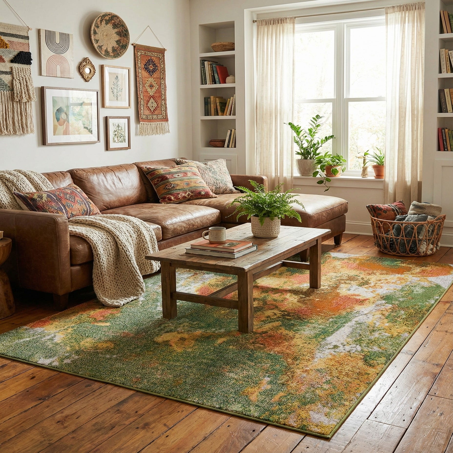 Primary color is Green. Colors in this rug include: Green, Gray, Ivory, Light Brown, Orange, Red, Yellow.