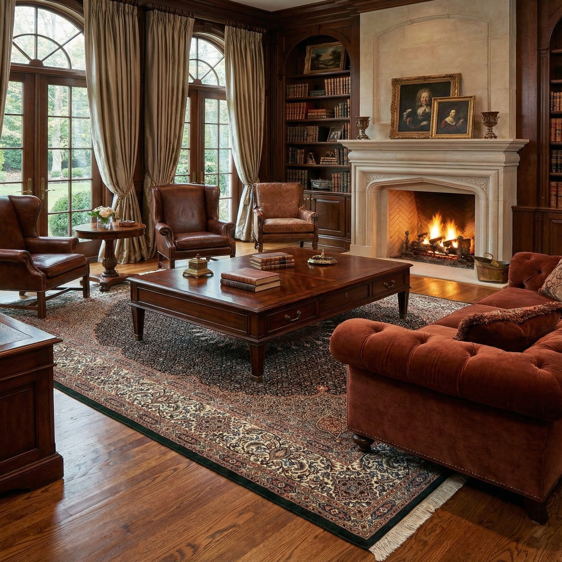 Primary color is Green. Colors in this rug include: Green, Green, Cream, Brown, Orange, Blue, Dark Blue.